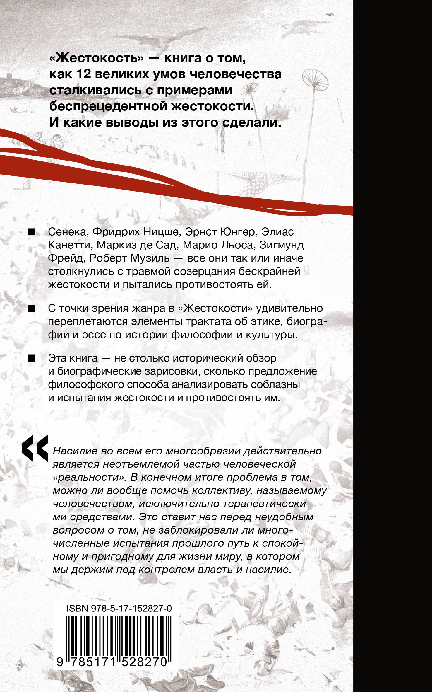 Человек - "жестокое животное". Этот радикальный тезис является отправной точкой дискурсивной истории жестокости. Ученый-культуролог Вольфганг Мюллер-Функ определяет жестокость как часть цивилизационного процесса и предлагает свой взгляд на этот душераздирающий аспект человеческой эволюции, который ускользает от обычных описаний. В своей истории из двенадцати глав - о Роберте Мюзиле и Эрнсте Юнгере, Сенеке и Фридрихе Ницше, Элиасе Канетти и Маркизе де Саде, Жане Амери и Марио Льосе, Зигмунде Фрейде и Морисе Мерло-Понти, Исмаиле Кадаре и Артуре Кёстлере - Вольфганг Мюллер-Функ рассказывает поучительную историю жестокости и предлагает философский способ противостоять ее искушениям.| Издательство | ИЗДАТЕЛЬСТВО "АСТ" |