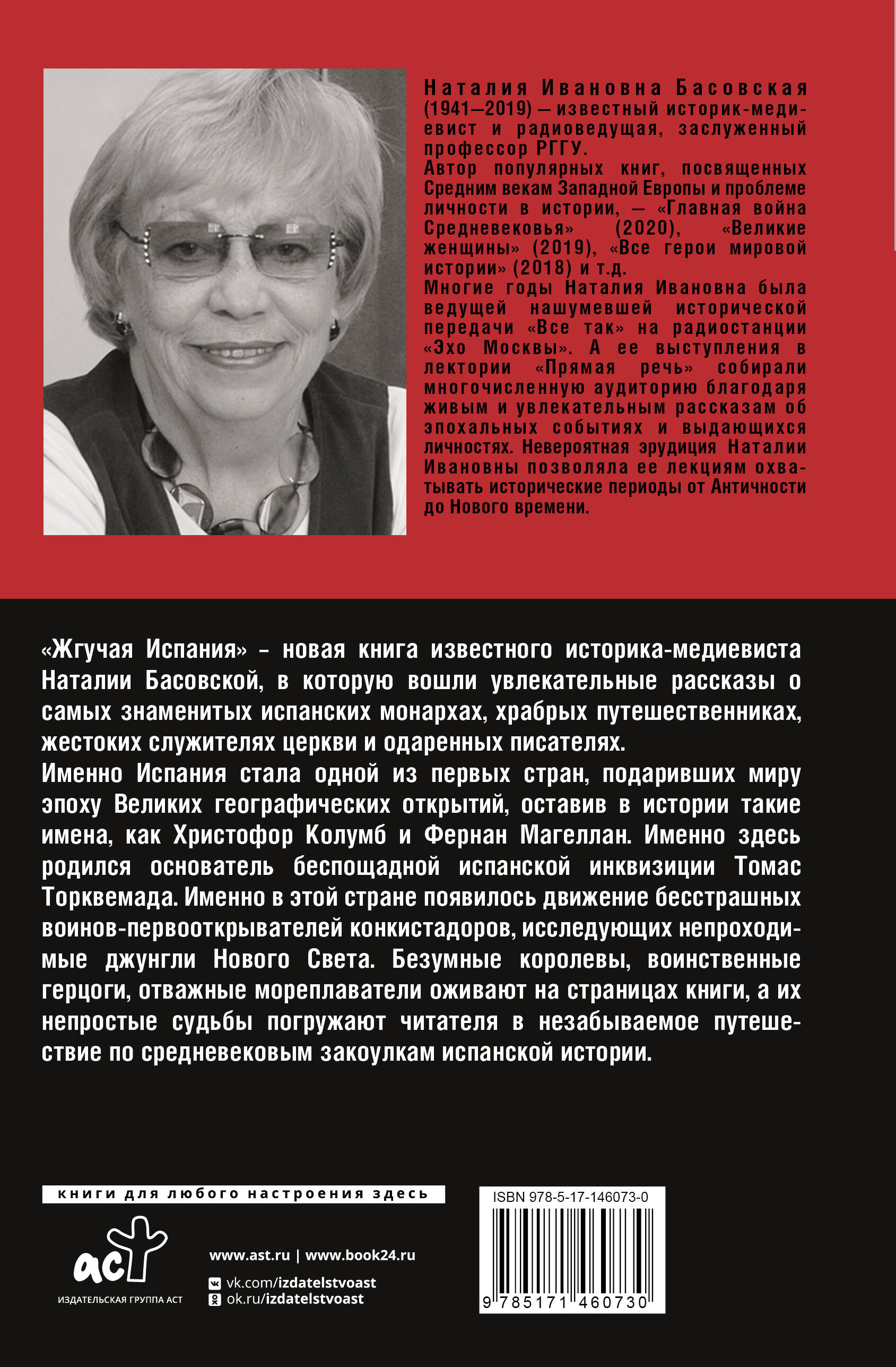 Книга историка-медиевиста Наталии Басовской «Жгучая Испания» отправит вас в путешествие по хронике событий Испании с рассказами о ключевых лицах и фигурах страны, а также о конкистадорах, путешествиях испанских мореплавателей, Великих географических открытиях и пламени инквизиции. Интересный слог и красивые иллюстрации позволят всем любителям культуры Испании погрузиться в многогранную историю страны, которая так прекрасна, и так беспощадна.| Издательство | АСТ |