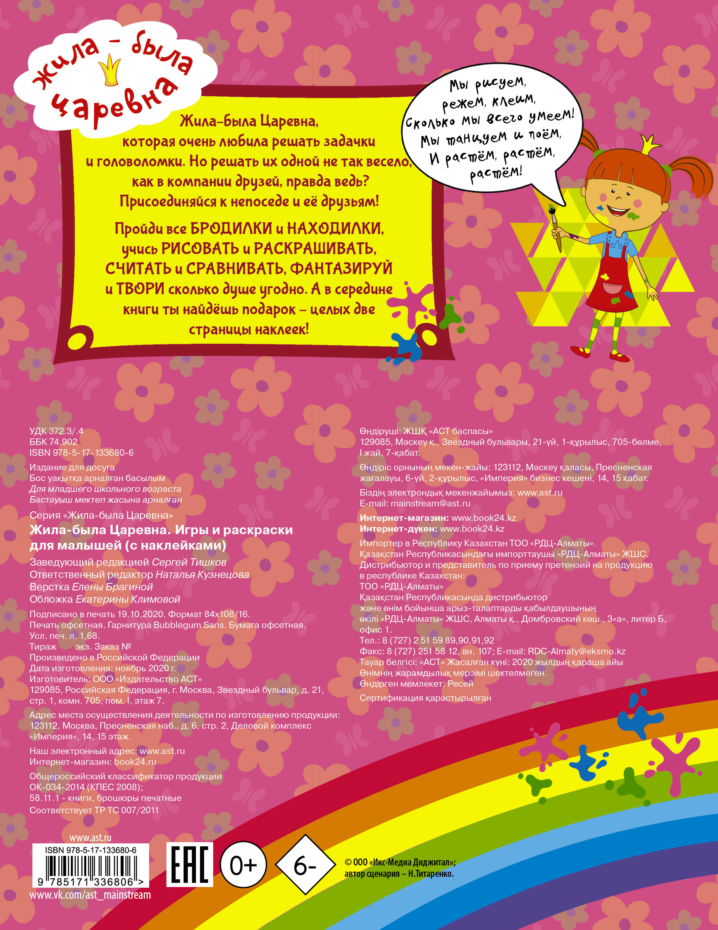 Жила-была Царевна, которая очень любила решать задачки и головоломки. Но решать их одной не так весело, как в компании друзей, правда ведь? Присоединяйся к непоседе и её друзьям! Пройди все бродилки и находилки, учись рисовать и раскрашивать, считать и сравнивать, фантазируй и твори сколько душе угодно. А в середине книги ты найдёшь подарок - целых две страницы наклеек!| Издательство | ИЗДАТЕЛЬСТВО "АСТ" |