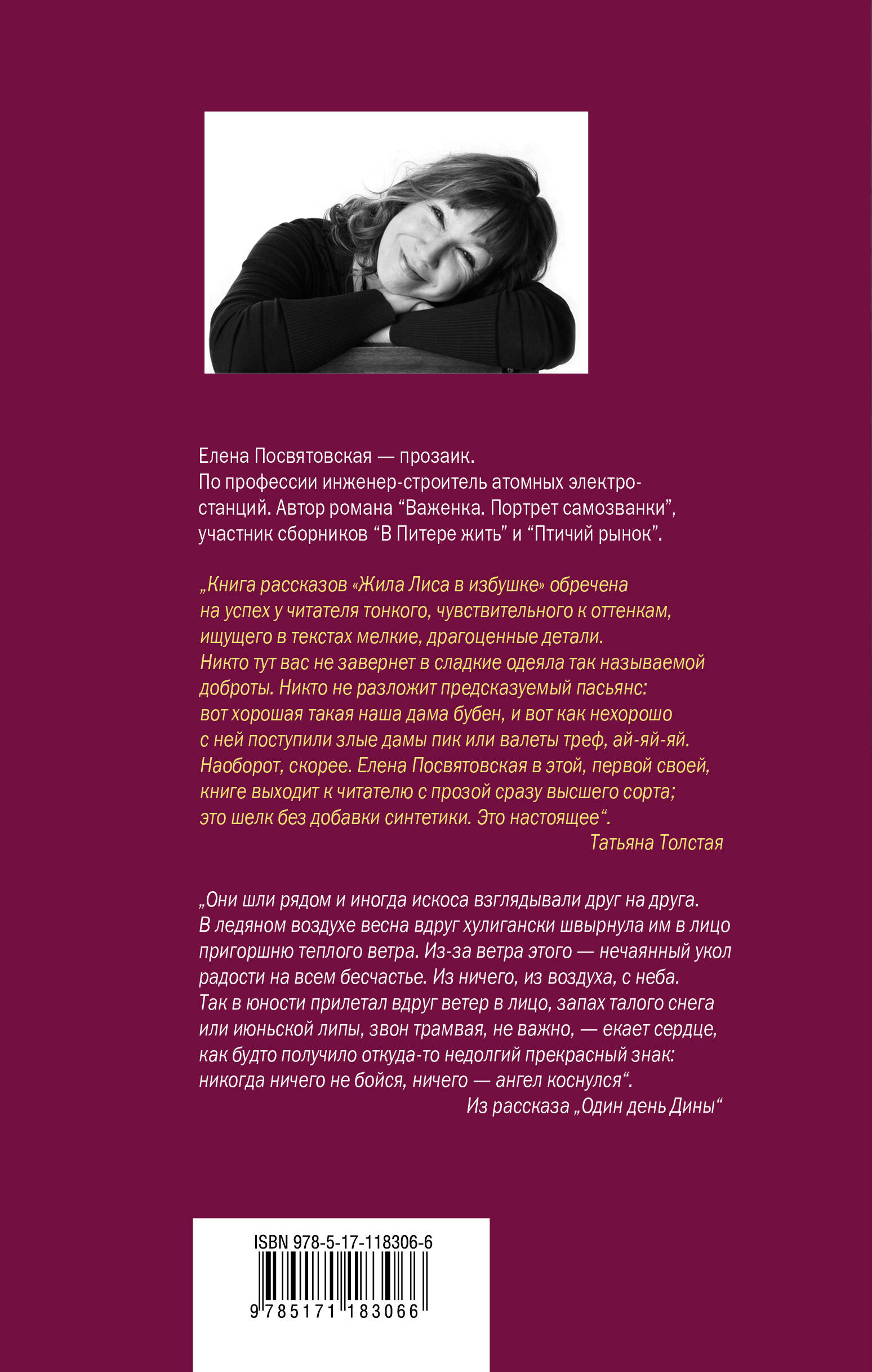 Елена Посвятовская - прозаик. По профессии инженер-строитель атомных электростанций. Автор романа "Важенка. Портрет самозванки", участник сборников "В Питере жить" и "Птичий рынок". "Книга рассказов "Жила Лиса в избушке" обречена на успех у читателя тонкого, чувствительного к оттенкам, ищущего в текстах мелкие, драгоценные детали. Никто тут вас не завернет в сладкие одеяла так называемой доброты. Никто не разложит предсказуемый пасьянс: вот хорошая такая наша дама бубен, и вот как нехорошо с ней поступили злые дамы пик или валеты треф, ай-яй-яй. Наоборот, скорее. Елена Посвятовская в этой, первой своей, книге выходит к читателю с прозой сразу высшего сорта; это шелк без добавки синтетики. Это настоящее" (Татьяна Толстая).| Издательство | Издательство "АСТ" |