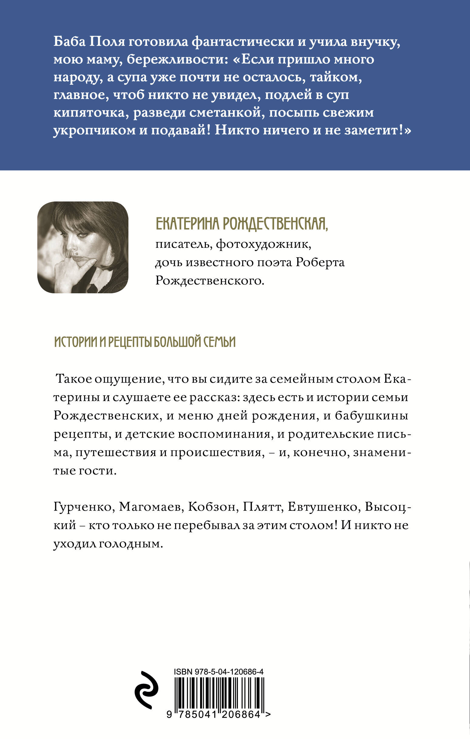 Екатерина Рождественская - дочь поэта-шестидесятника Роберта Рождественского, известный фотохудожник. В книге объединены трогательные детские воспоминания автора о семье, легендарном Роберте Рождественском, ежедневных обедах и праздничных застольях. В нежные и душевные мемуары гармонично вписались рецепты старинных семейных блюд, стихи отца и раритетные фотографии эпохи «оттепели». Здесь собраны как рецепты блюд, ставших визитной карточкой семьи Рождественских, так и обычные рецепты, используемые в арсенале любой советской хозяйки. Читая книгу, окунаешься в жизнь 60-х-70-х годов, атмосферу старой Москвы, поэзии, как будто сидишь за одним столом с замечательной семьей Екатерины Рождественской и их знаменитыми гостями: Евгением Евтушенко, Людмилой Гурченко, Муслимом Магомаевым, Иосифом Кобзоном, Владимиром Высоцким, которые жили-были, ели-пили…| Издательство | ООО "Издательство "Эксмо" |