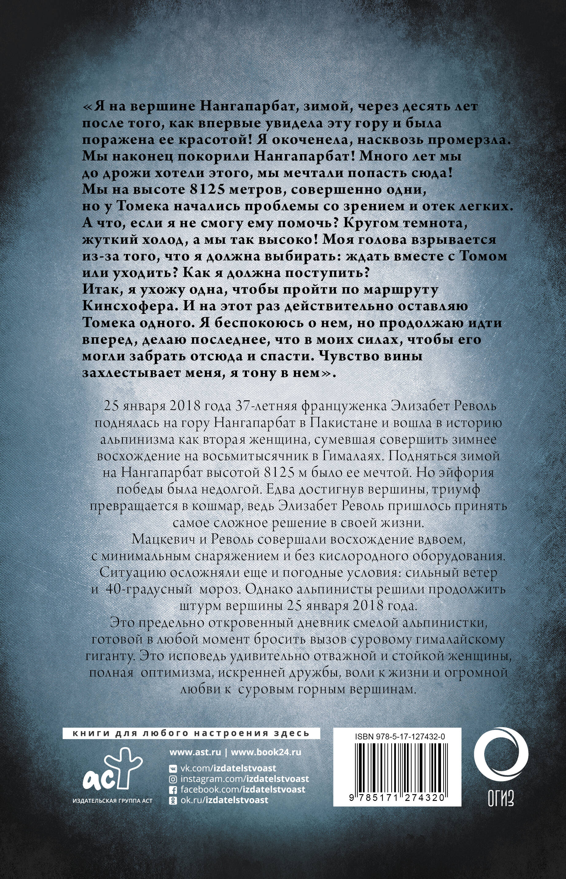 25 января 2018 года 37-летняя француженка Элизабет Револь поднялась на гору Нангапарбат в Пакистане и вошла в историю альпинизма как вторая женщина, сумевшая совершить зимнее восхождение на восьмитысячник в Гималаях. Восхождение она совершала со своим товарищем польским альпинистом Томашем Мацкевичем. Подняться зимой на Нангапарбат высотой 8125 м было ее мечтой. Но эйфория победы была недолгой. Едва достигнув вершины, триумф превратился в кошмар: из-за тяжелых погодных условий и отсутствия кислородного оборудования, Томек получил отек легких, и Элизабет Револь пришлось принять самое сложное решение в своей жизни: оставить своего товарища одного, но сделать все, что в ее силах, чтобы его могли забрать и спасти. Это предельно откровенный дневник смелой альпинистки, готовой в любой момент бросить вызов суровому гималайскому гиганту. Трагическая исповедь удивительно смелой и стойкой женщины, полная оптимизма, искренней дружбы, воли к жизни и огромной любви к суровым горным вершинам.
