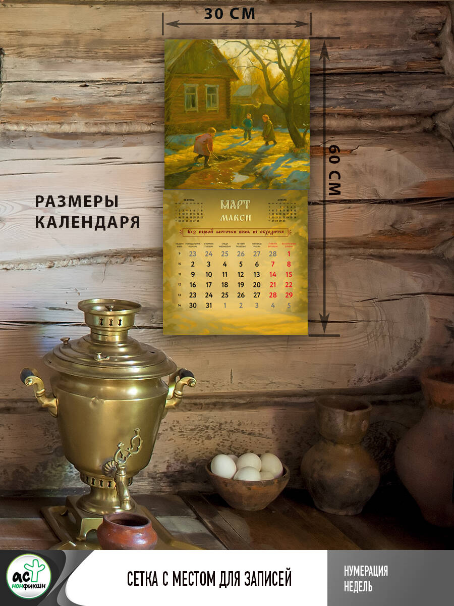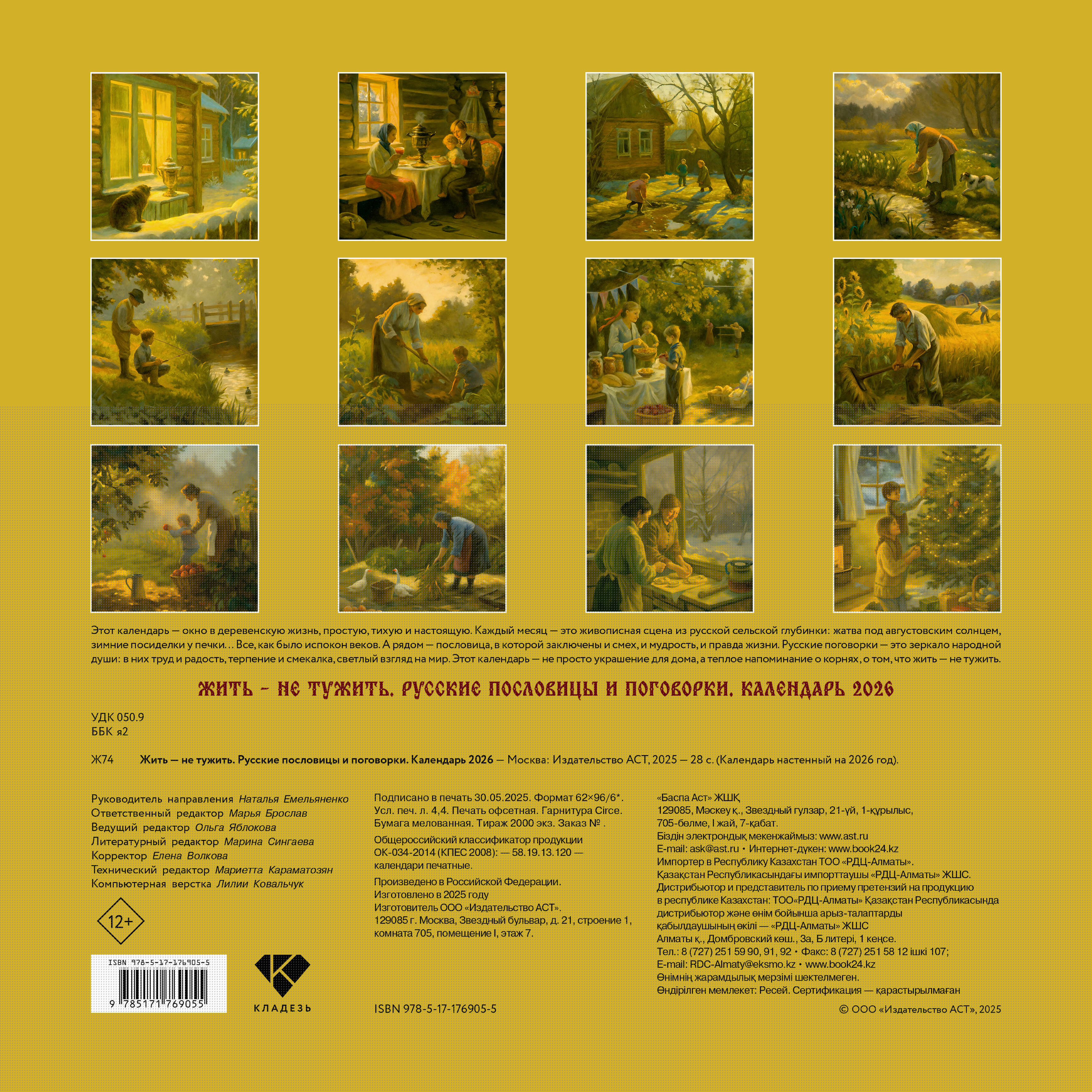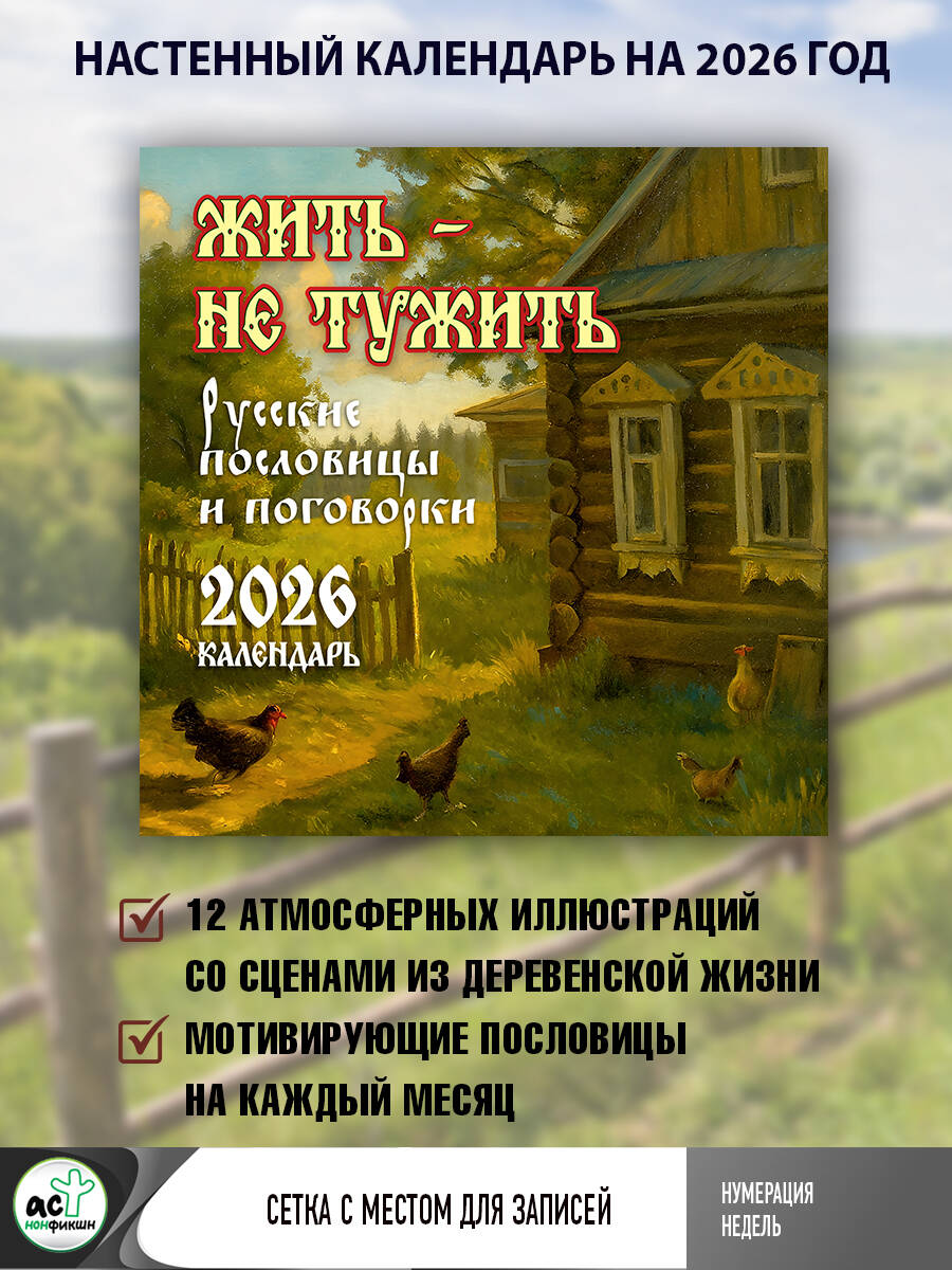 Этот календарь - окно в деревенскую жизнь, простую, тихую и настоящую. Каждый месяц - это живописная сцена из русской сельской глубинки: жатва под августовским солнцем, зимние посиделки у печки... Все, как было испокон веков. А рядом - пословица, в которой заключены и смех, и мудрость, и правда жизни. Русские поговорки - это зеркало народной души: в них труд и радость, терпение и смекалка, светлый взгляд на мир. Этот календарь - не просто украшение для дома, а теплое напоминание о корнях, о том, что жить - не тужить.| Издательство | Издательство "АСТ" |