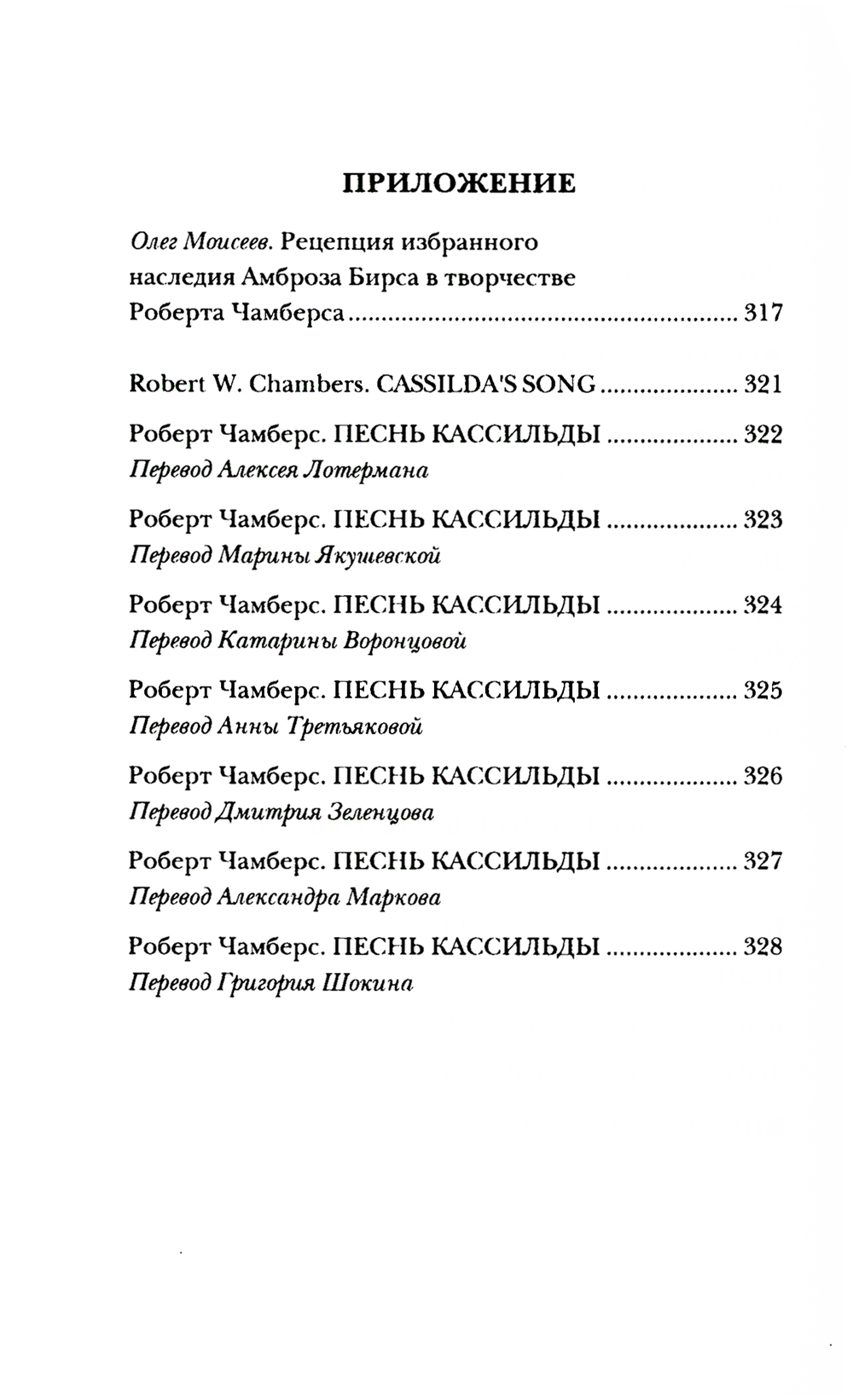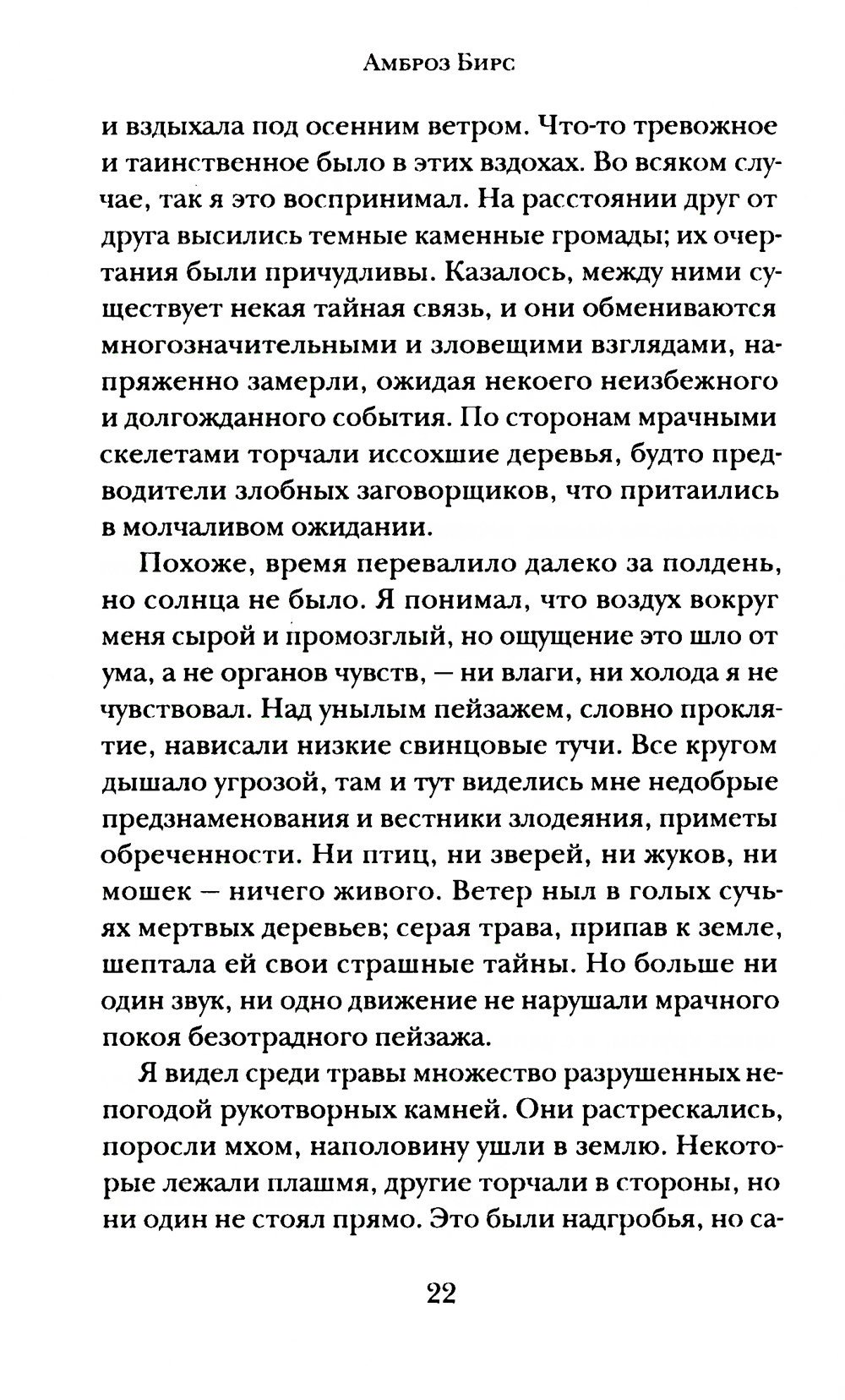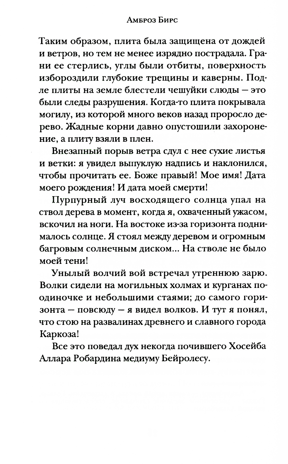 Великий американский писатель Амброз Бирс по праву считается ровней Эдгара По в традиции американской новеллы XIX века. Его притчи и «страшные рассказы» - хрестоматийное чтение и гордость словесности США. Ветеран Гражданской войны, в своих произведениях Бирс отражает собственный опыт борьбы за жизнь и рассудок в военное и мирное время... В приложении представлены переводы стихотворения «Песнь Кассильды» Роберта Чамберса, писателя-мистика, создавшего полноценную «мифологию» Каркозы, которая стала основой его великого сборника «Король в Желтом».| Издательство | Рипол Классик |