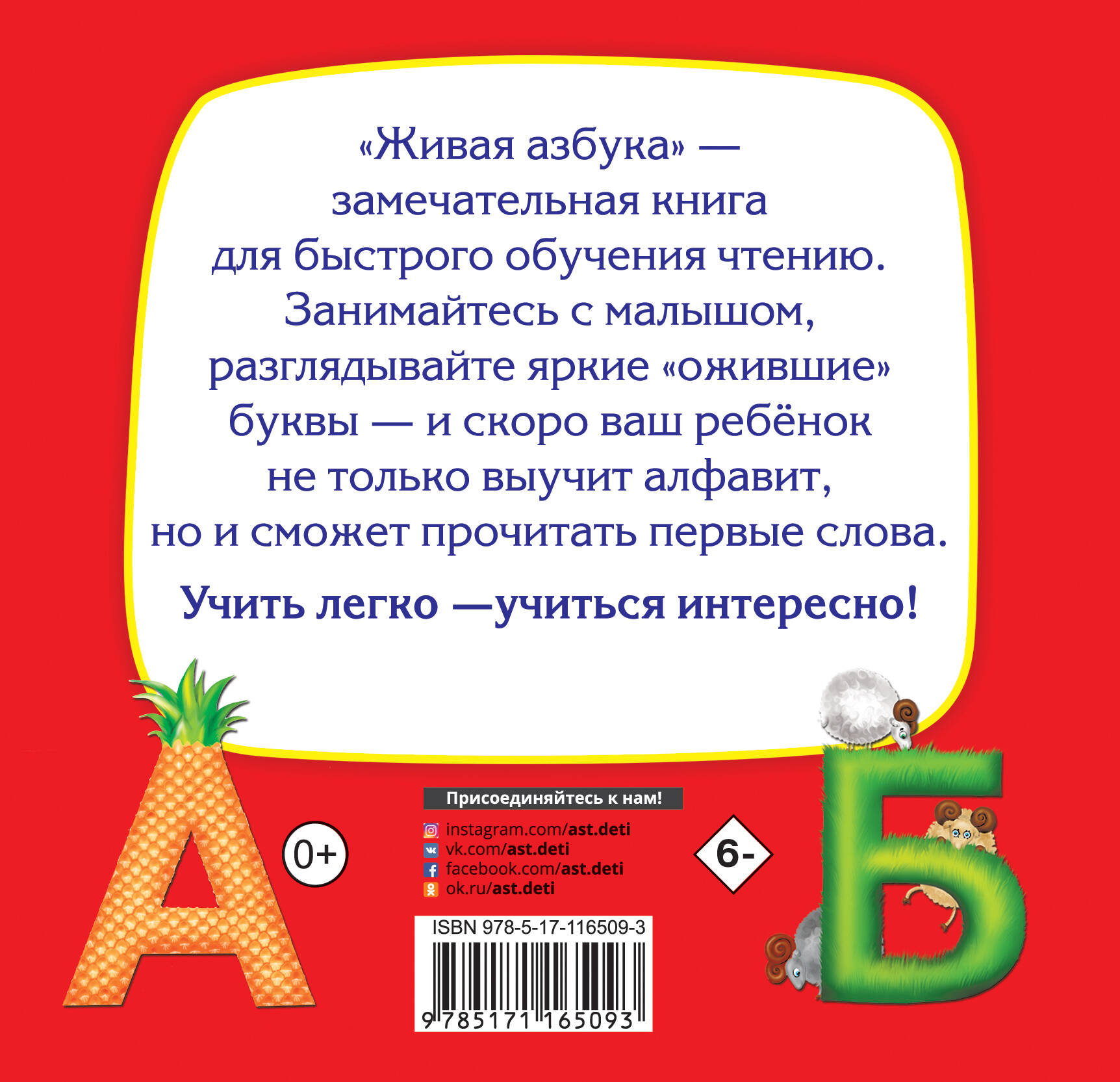 О чём эта книга «Живая азбука» - пособие для занятий с детьми от 2 лет. Книга поможет ребёнку познакомиться с буквами алфавита и прочитать свои первые слова. Кому эта книга будет интересна Азбука с картинками для детей от 2 лет. Каковы особенности этой книги • Яркие и запоминающиеся «ожившие» буквы помогут малышу выучить алфавит от «А» до «Я». • Знакомство с алфавитом способствует развитию речи, памяти и мышления ребёнка. • Совместные занятия - отличный способ установить доверительные отношения с малышом. • Удобный формат позволит взять книгу в дорогу.| Издательство | ИЗДАТЕЛЬСТВО "АСТ" |