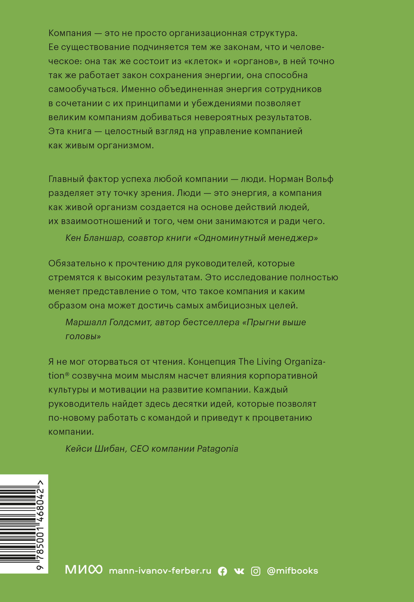 Книга о любопытной организационной модели, объясняющей деятельность компании через общее мироустройство - как биологическое (клетка - орган - человек - совокупность людей), так и физическое, в том числе через законы термодинамики, и все это приправлено психологией коллективного - как энергия людей сливается воедино в достижении общей значимой цели. Компания - это живой организм. Как и любое существо, она состоит из "клеток" и "органов", подчиняется законам сохранения энергии. И, конечно, коллективный разум компании тем сильнее, чем ярче и умнее ее работники. Можно оценивать работу компании по финансовым показателям и доле рынка. Но это лишь производные: теперь невозможно работать без понимания миссии компании, ее ценностей и слияния энергии всех сотрудников. Прочитав эту книгу, вы посмотрите на свою организацию другими глазами: как на человека, который способен учиться, развиваться и перестраиваться самостоятельно, руководствуясь своими принципами и целями. Иначе за стремительными изменениями внешней среды вам не успеть. Для кого эта книга: Для владельцев бизнеса. Для руководителей и директоров. От автора: Это моя первая большая книга. Хоть я и ее автор, по правде говоря, я часто чувствовал себя просто инструментом, который позволил посланию книги ожить. Четыре с лишним года, пока я писал эту книгу, мне казалось, что я нахожусь во власти чего-то большего, чем я сам. Многое из того, что написано в книге, было рождено в процессе написания. Я уверен, что это сообщение необходимо нашему обществу. Проблемы и вызовы, с которыми мы сталкиваемся, не могут быть решены, пока мы смотрим на них через призму старой парадигмы. Но как только мы изменим фокус, то, что когда-то было трудным или даже невозможным, станет легким и простым.| Издательство | МАНН, ИВАНОВ И ФЕРБЕР ООО |