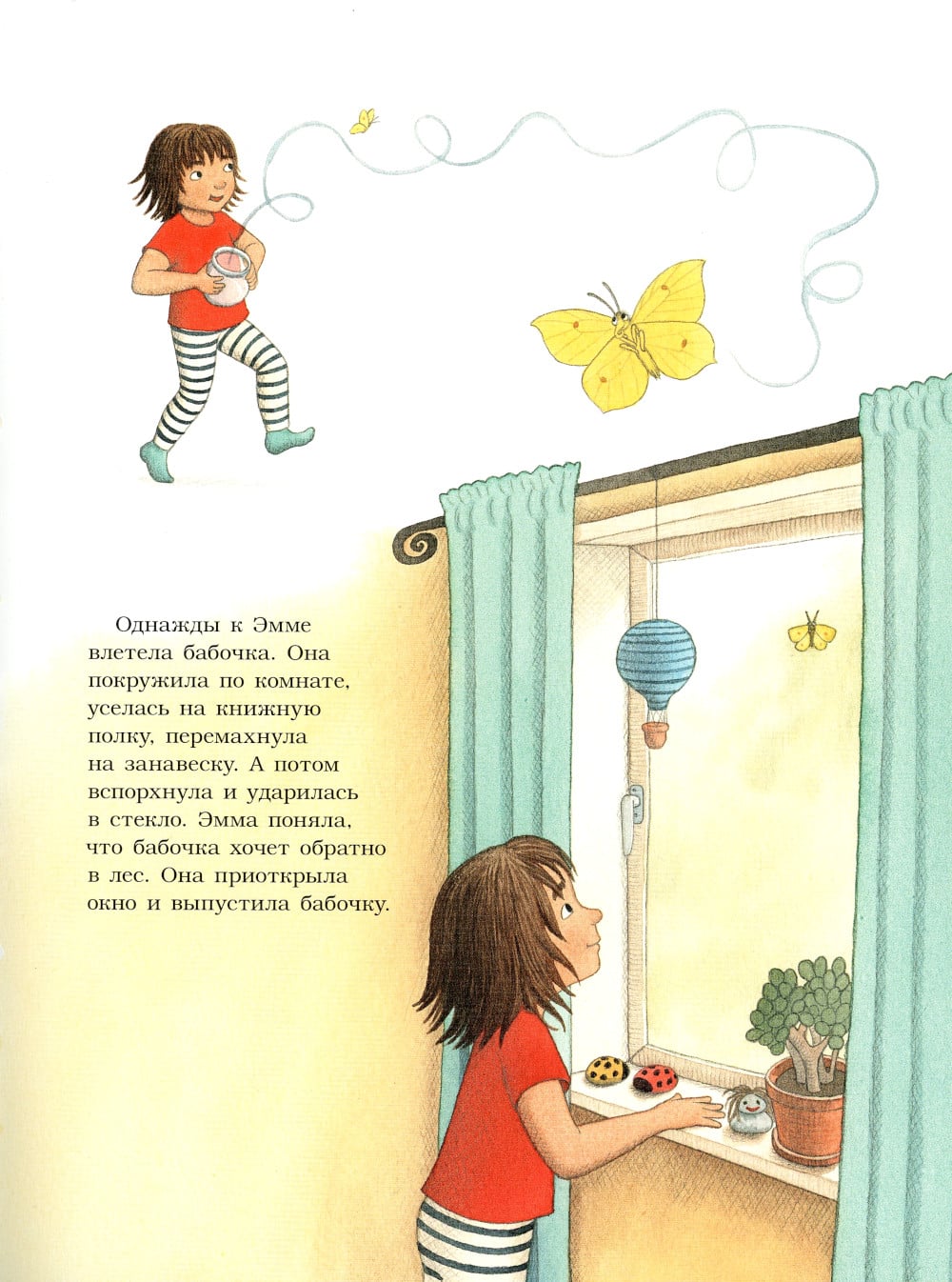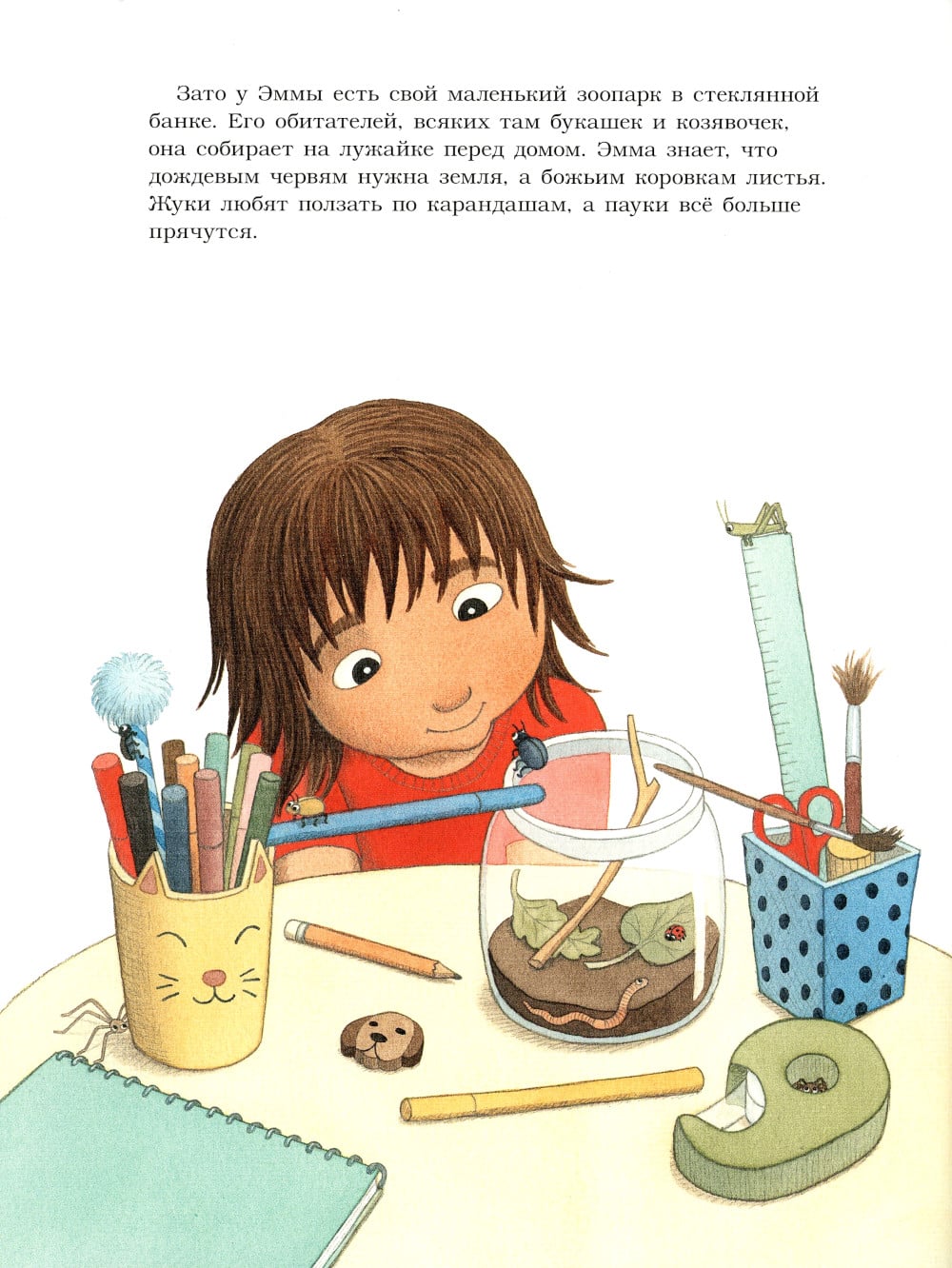 Эмма очень любит животных. Однажды она замечает в траве гусеницу. Эмме кажется, что гусеничка замёрзла, и она берёт её с собой, чтобы согреть. Но в кафе, куда они с мамой заходят, с животными нельзя, и Эмма прячет гусеницу в большом горшке у входа. Наскоро перекусив, они бегут в парикмахерскую, и в спешке Эмма забывает про свою гусеницу. А вспомнив, мчится обратно, думая лишь о том, чтобы гусеничка не умерла.| Издательство | Мелик-Пашаев |