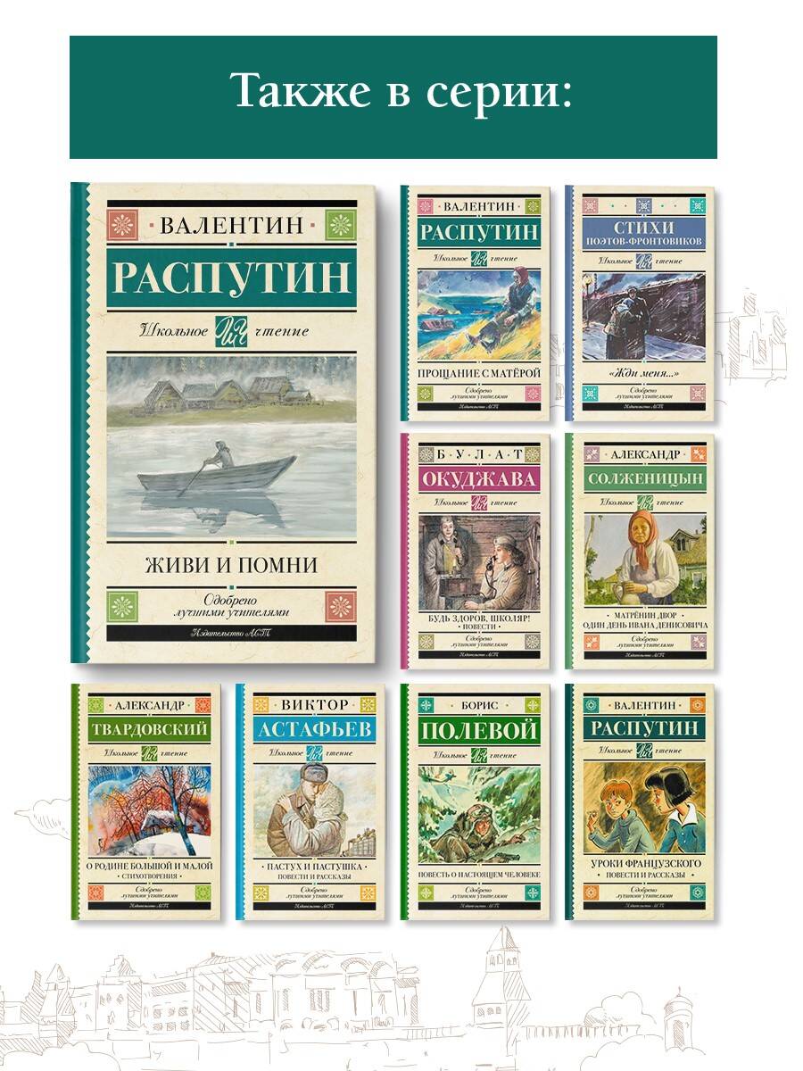 Повесть русского советского писателя Валентина Распутина "Живи и помни" (1974) - это произведение о войне, испытывающей каждого человека, и о трагической любви простой, преданной женщины. Андрей Гуськов, тяжело раненный на фронте, после госпиталя решает повидаться с родными, однако сразу становится дезертиром. Опасаясь ареста, он так и не приходит домой, долгие месяцы скрываясь в окрестностях родной деревни. Его обнаруживает только жена Настена - и поддерживает мужа, помогает ему и хранит его тайну. В 1977 году за повесть "Живи и помни" Валентин Распутин был удостоен Государственной премии. По повести поставлены спектакли и опера, снят фильм.| Издательство | Издательство "АСТ" |