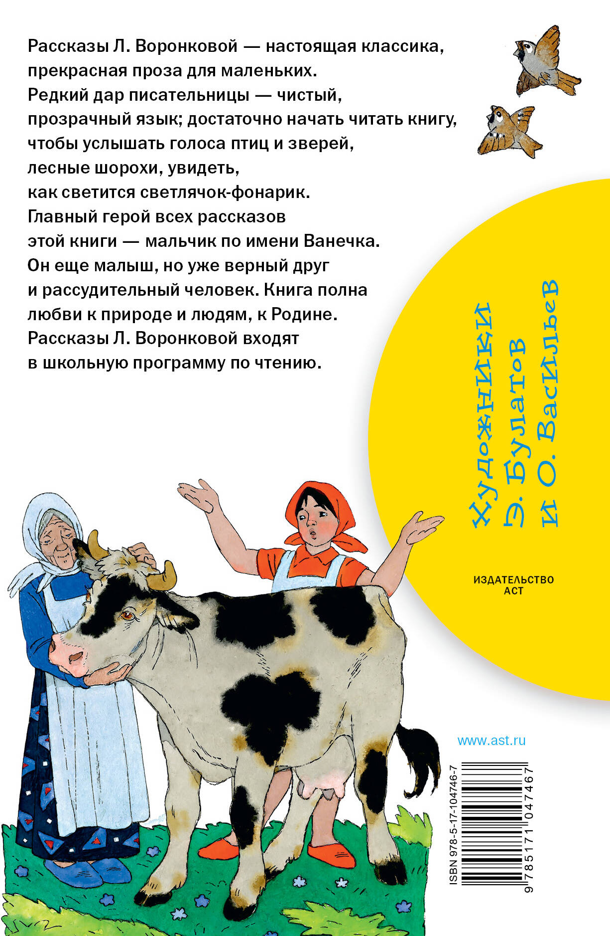 Рассказы Л. Воронковой - настоящая классика, прекрасная проза для маленьких. Редкий дар писательницы - чистый, прозрачный язык; достаточно начать читать книгу, чтобы услышать голоса птиц и зверей, лесные шорохи, увидеть, как светится светлячок-фонарик. Главный герой всех рассказов этой книги мальчик по имени Ванечка. Он ещё малыш, но уже верный друг и рассудительный человек. Книга полна любви к природе и людям, к Родине. Рассказы Л. Воронковой входят в школьную программу по чтению. Иллюстрации Э. Булатова и О. Васильева.| Издательство | Издательство "АСТ" |