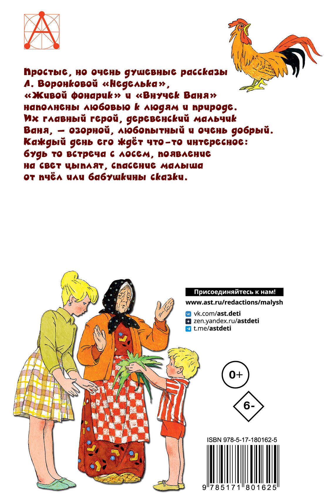Простые, но очень душевные рассказы Л. Воронковой «Неделька», «Живой фонарик» и «Внучек Ваня» наполнены любовью к людям и природе. Их главный герой, деревенский мальчик Ваня, - озорной, любопытный и очень добрый. Каждый день его ждёт что-то интересное: будь то встреча с лосем, появление на свет цыплят, спасение малыша от пчёл или бабушкины сказки.| Издательство | Издательство "АСТ" |