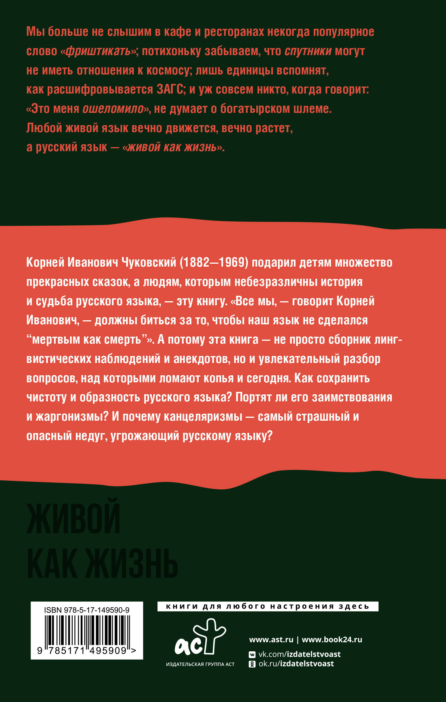 Мы больше не слышим в кафе и ресторанах некогда популярное слово "фриштикать"; потихоньку забываем, что спутники могут не иметь отношения к космосу; лишь единицы вспомнят, как расшифровывается загс; и уж совсем никто, когда говорит: "Это меня ошеломило", не думает о богатырском шлеме. Любой живой язык вечно движется, вечно растет, а русский язык - "живой как жизнь". Корней Иванович Чуковский (1882-1969) подарил детям множество прекрасных сказок, а людям, которым небезразличны история и судьба русского языка, - эту книгу. "Все мы, - говорит Корней Иванович, - должны биться за то, чтобы наш язык не сделался "мертвым как смерть"". А потому эта книга не просто сборник лингвистических наблюдений и анекдотов, но и увлекательный разбор вопросов, над которыми ломают копья и сегодня. Как сохранить чистоту и образность русского языка? Портят ли его заимствования и жаргонизмы? И почему канцеляризмы - самый страшный и опасный недуг, угрожающий русскому языку?| Издательство | ИЗДАТЕЛЬСТВО "АСТ" |