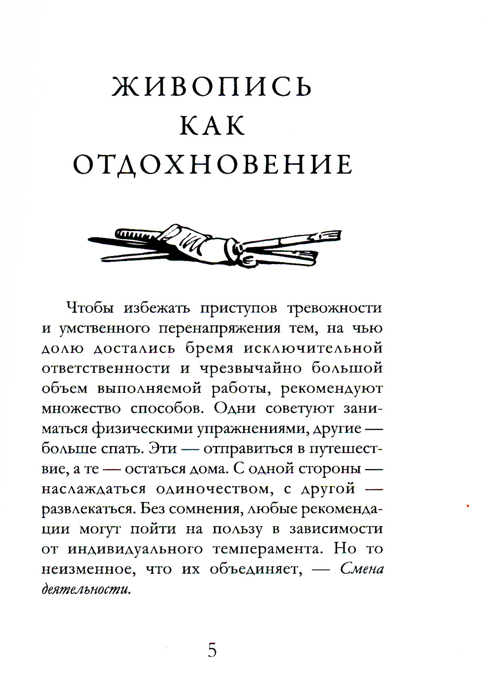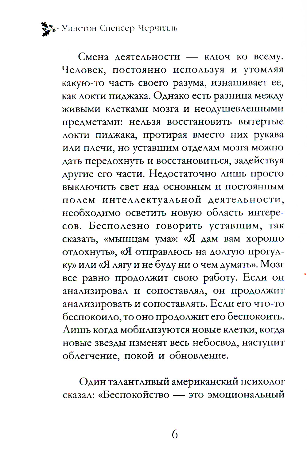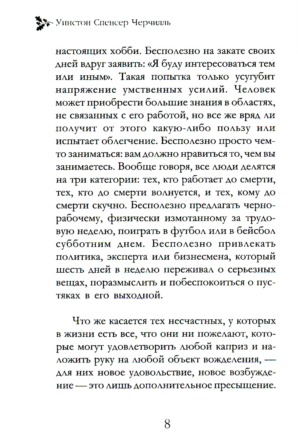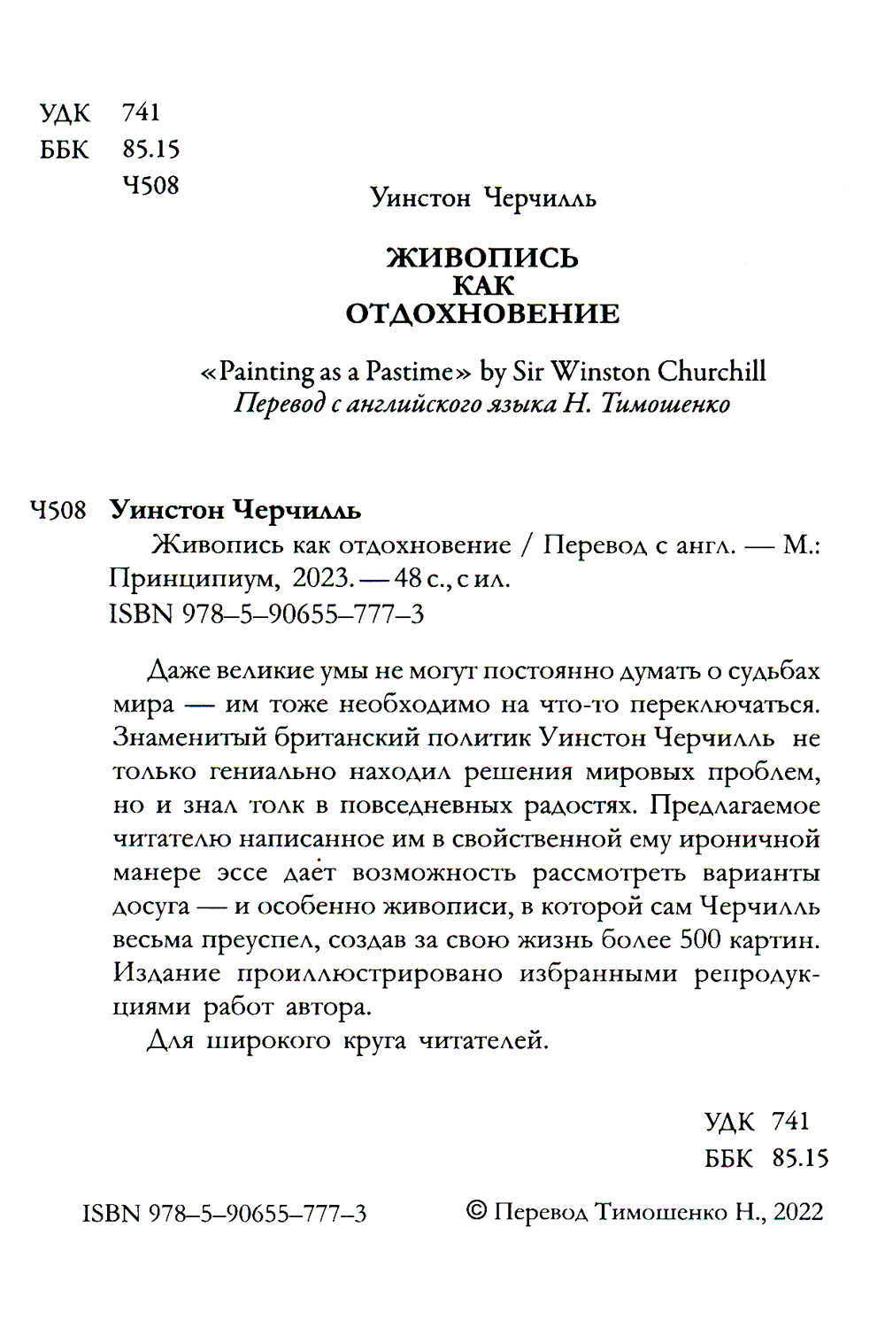 Даже великие умы не могут постоянно думать о судьбах мира - им тоже необходимо на что-то переключаться. Знаменитый британский политик Уинстон Черчилль не только гениально находил решения мировых проблем, но и знал толк в повседневных радостях. Предлагаемое читателю написанное им в свойственной ему ироничной манере эссе дает возможность рассмотреть варианты досуга - и особенно живописи, в которой сам Черчилль весьма преуспел, создав за свою жизнь более 500 картин. Издание проиллюстрировано избранными репродукциями работ автора. Для широкого круга читателей.| Издательство | Принципиум |