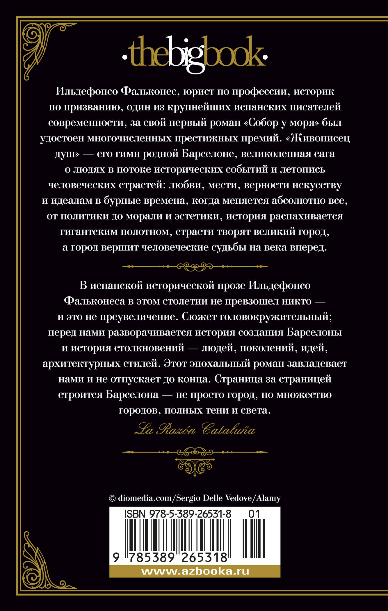 Добро пожаловать в Барселону начала XX века - расцвет модернизма, столкновение идеологий, конфликт поколений, бурлят споры, кипит кровь. Молодой художник Далмау Сала, влюбленный в жизнь, в живопись, в женщину, разрывается между подлинным искусством, требующим полной самоотдачи, и необязательными, но удобными поделками для богатых и равнодушных, между наслаждением и долгом, между романтикой и комфортом. Далмау ищет себя и свой истинный путь - и вместе с возлюбленной пройдет страшными тропами посреди восторга и ужаса мира, стоящего на пороге нового века. Ильдефонсо Фальконес, юрист по профессии, историк по призванию, один из крупнейших испанских писателей современности, за свой первый роман "Собор у моря" был удостоен многочисленных престижных премий, в том числе Euskadi de Plata (2006, Испания), Qué Leer (2007, Испания) и премии Джованни Боккаччо (2007, Италия). Книги Фальконеса уже разошлись общим тиражом более 10 миллионов экземпляров в нескольких десятках стран. "Живописец душ" - его гимн родной Барселоне, великолепная сага о людях в потоке исторических событий и летопись человеческих страстей: любви, мести, верности искусству и идеалам в бурные времена, когда меняется абсолютно все, от политики до морали и эстетики, история распахивается гигантским полотном, страсти творят великий город, а город вершит человеческие судьбы на века вперед.| Издательство | Азбука-Аттикус Издат.группа ООО |