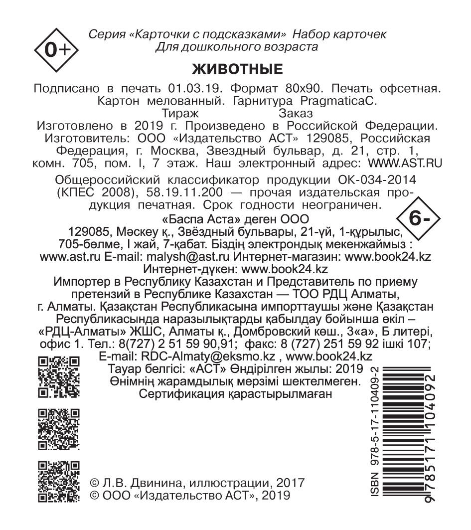 О чем эта книга Набор карточек животных с картинками-подсказками. Кому эта книга будет интересна Любознательным малышам и заботливым родителям! Каковы особенности этой книги •Карточки с весёлыми и яркими картинками-подсказками познакомят ребёнка с животными. • Игры с карточками расширяют словарный запас, улучшают память и внимание, тренируют пальчики, развивают наблюдательность и мелкую моторику. • Комплект карточек универсален - его можно использовать как на занятиях дома, так и в детском саду. Учиться по карточкам полезно, весело, интересно!
