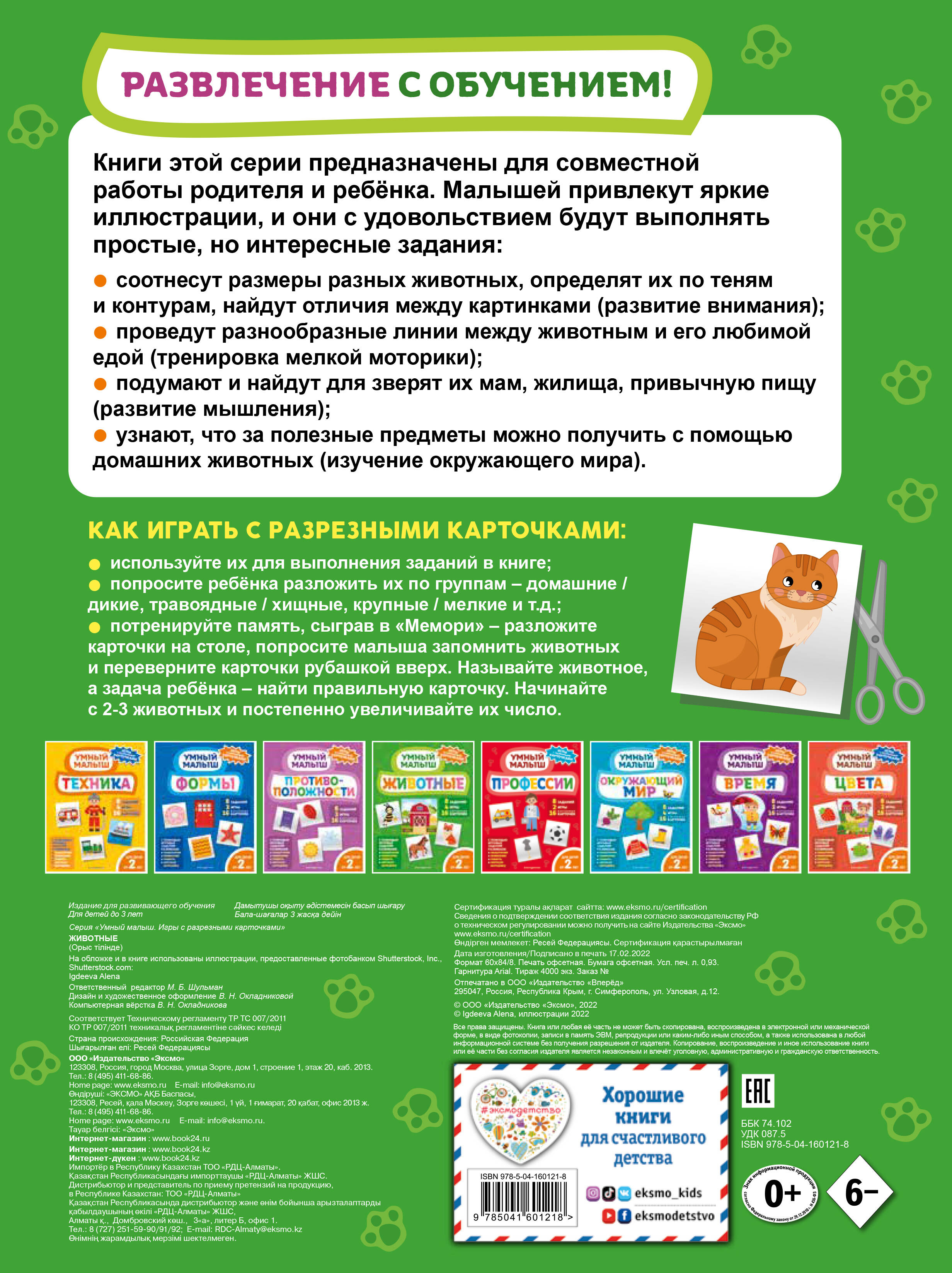 Девиз книг этой серии «Развлечение с обучением»! Малышей привлекут яркие иллюстрации, а выполняя простые задания, они потренируют своё мышление, внимание, память и изучат окружающий мир. Картонные разрезные карточки, входящие в издание, пригодятся как для выполнения задачек, так и для самостоятельного использования. Благодаря этой книге ребёнок узнает о разных видах домашних и диких животных, их среде обитания и особенностях.| Издательство | Эксмо |
