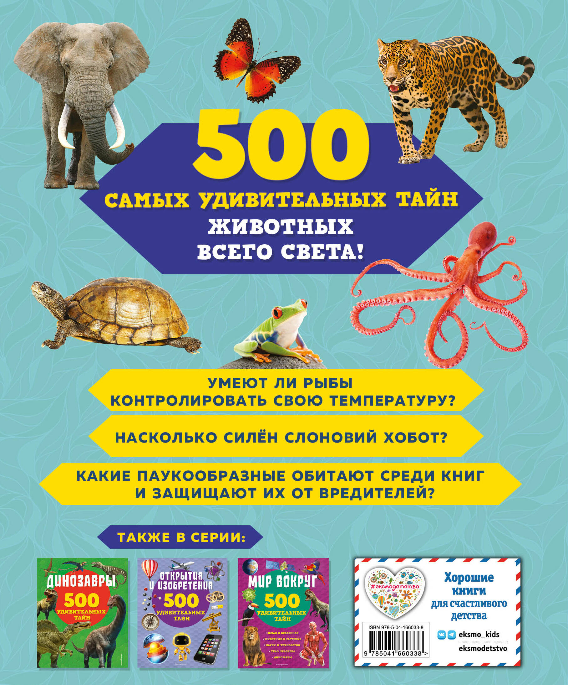 Приготовься: тебя ждёт невероятное приключение в мире животных! Эта книга раскроет 500 удивительных, порой совершенно необъяснимых, а иногда даже шокирующих тайн различных представителей фауны Земли. Ты узнаешь, сколько веков могут жить черепахи, чем питаются губки и кораллы, какие рыбы помнят динозавров, почему змеи сбрасывают кожу, кто из птиц молчит почти всю жизнь, а кто - наоборот, практически никогда не затихает, чем сумчатые отличаются от остальных млекопитающих, какая черта объединяет всех крупных кошачьих, а также получишь ответы на множество других любопытных вопросов!| Издательство | Эксмо |