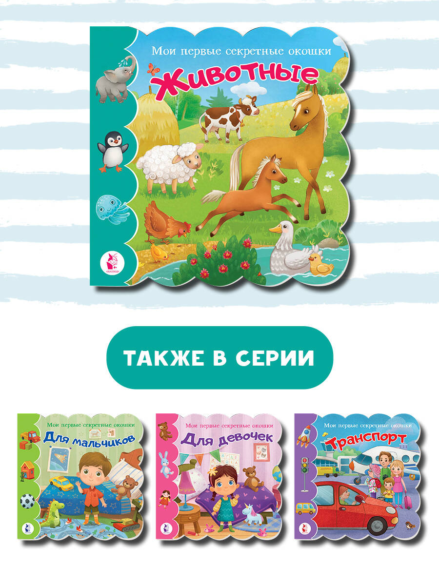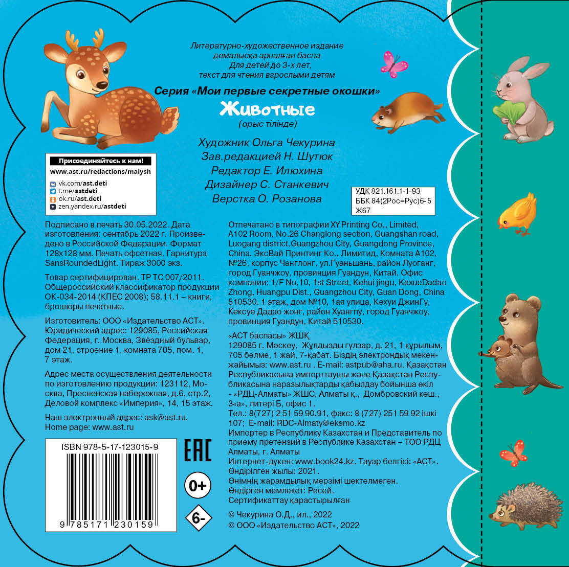 "Мои первые секретные окошки" - это первые познавательные и забавные книжки для малышей об окружающем мире. Маленький читатель познакомится с самыми разными животными: зверушками с фермы и леса, животными Севера, Африки и Австралии и даже побывает в океане! А под большими окошками на каждом развороте малыша ждут веселые сюрпризы. Эта книга поможет развить речь, образное мышление и фантазию!| Издательство | ИЗДАТЕЛЬСТВО "АСТ" |
