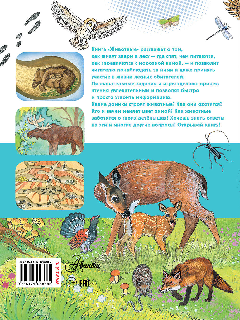 Книга "Животные" не только расскажет юному читателю об удивительном животном мире, но и позволит самому поучаствовать в жизни лесных обитателей, ведь в ней множество интерактивных заданий, которые помогут усвоить материал и просто весело провести время. Где живут животные? Кто и как готовит на зиму запасы? Как понять, кто прошел по тропинке по следам? Отвечай на вопросы, записывай и изучай! Для среднего школьного возраста.| Издательство | ИЗДАТЕЛЬСТВО "АСТ" |
