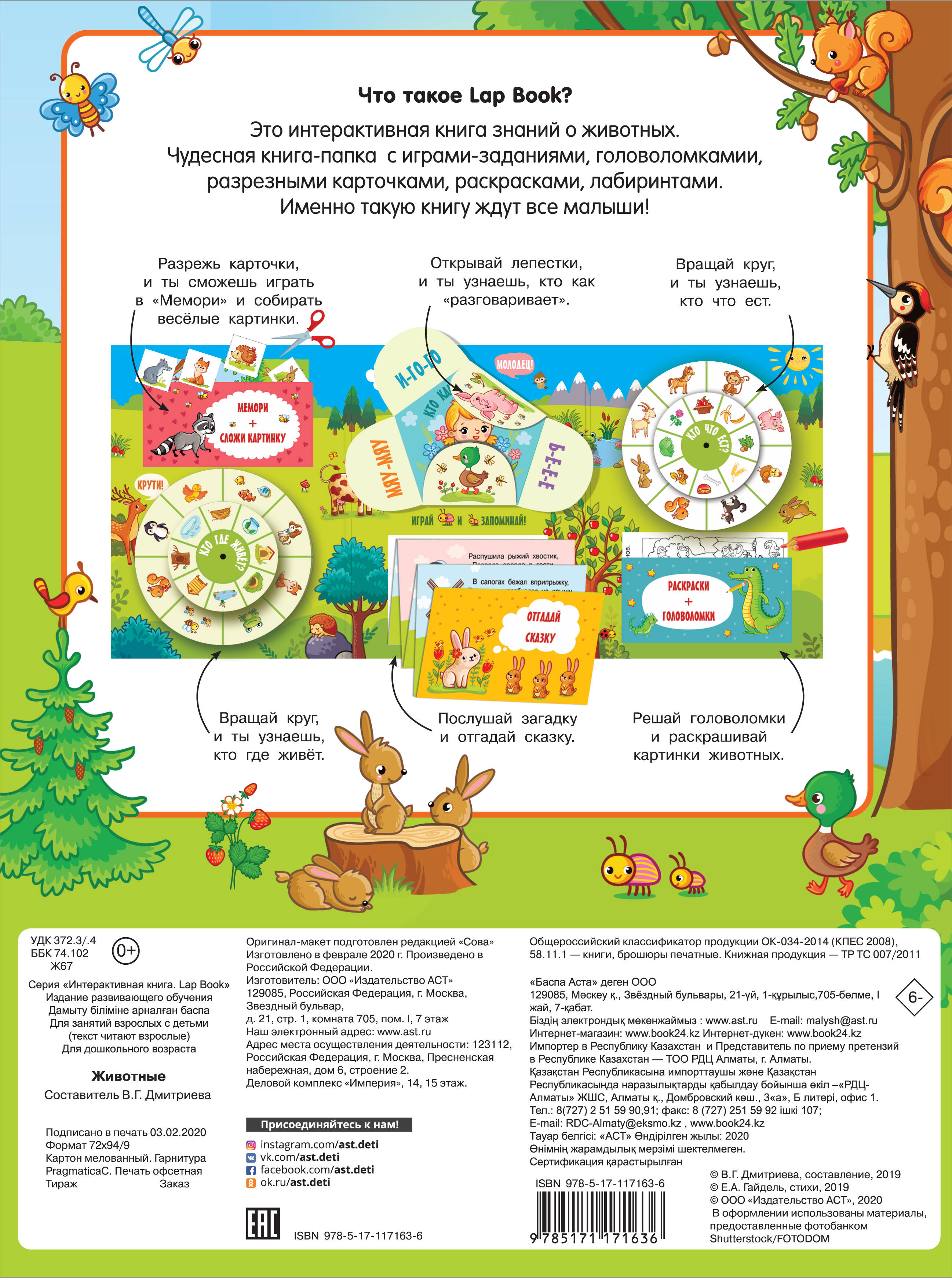 О чем эта книга Новинка на книжном рынке - уникальная серия «Интерактивная книга. Lap Book». Это занимательная, полезная книга-папка увлекательных развивающих игр для знакомства с миром животных. Кому эта книга будет интересна Чудесная книга-папка с играми-заданиями непременно порадует каждого малыша. Каковы особенности этой книги • Лэпбук - современная эффективная методика раннего развития и закрепления знаний. • Интерактивная книжка для дошколят с необычными деталями, крутящимися и раскладными модулями. • Чудесная книга-папка с играми-заданиями, головоломками, разрезными карточками, раскрасками, лабиринтами - идеальное развивающее пособие для получения знаний о животных, а также расширения кругозора, совершенствования речи, тренировки пальчиков. • Одновременно и книга, и игра для тех, кто хочет познакомиться с миром животных. • Оригинальное оформление - яркие подвижные элементы можно потрогать руками. • Большая красочная папка прослужит долго - составляющие комплекта выполнены из прочного картона. Лэпбук - помогает ребенку активно участвовать в занятиях, позволяет в занимательно-игровой форме узнать и запомнить много нового и интересного. Именно такую книгу ждут все малыши| Издательство | ИЗДАТЕЛЬСТВО "АСТ" |