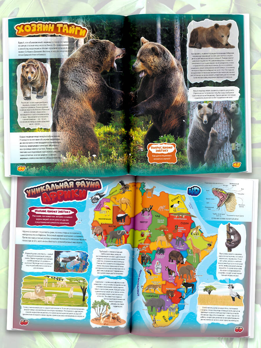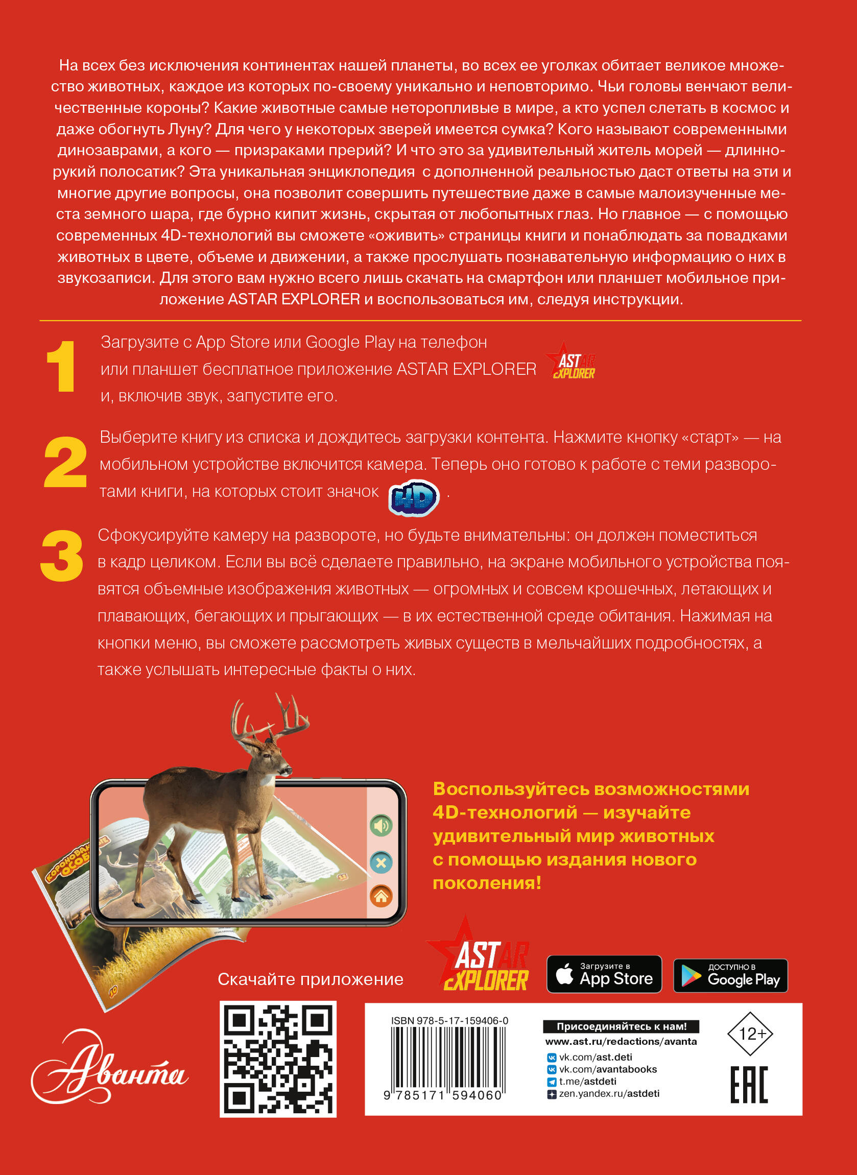 В этой большой энциклопедии представлены животные, обитающие в самых разных уголках нашей планеты. Это, например, медведи и лени, слоны и носороги, бегемоты и бородавочники, жирафы и зебры, пауки и скорпионы, скаты и пираньи, акулы и киты и даже исчезнувшие динозавры. Многие животные наверняка тебе уже знакомы, но в этом издании ты встретишь таких, о которых, возможно, ни разу и не слышал. И самое главное - некоторых из них ты сможешь увидеть в объеме и движении, ведь это не обычная книга, а энциклопедия, выполненная в формате интерактивных 3D-игр! Узнавай больше о животном мире нашей планеты, используя небывалые возможности дополненной реальности, - это не только полезно, но и очень интересно! Для младшего школьного возраста.| Издательство | Издательство "АСТ" |