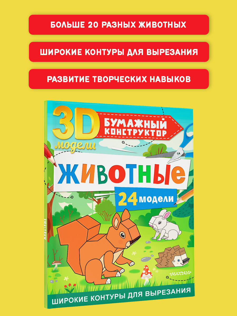 Три причины купить книгу: 24 уникальные 3D-модели животных. Широкие контуры для удобного и быстрого вырезания моделей. При сборке, склейке модели ребёнок может ошибиться. Но это не страшно. Каждая модель в книге специально продублирована, чтобы ребёнок мог попробовать сделать понравившуюся модель ещё раз.| Издательство | АСТ |