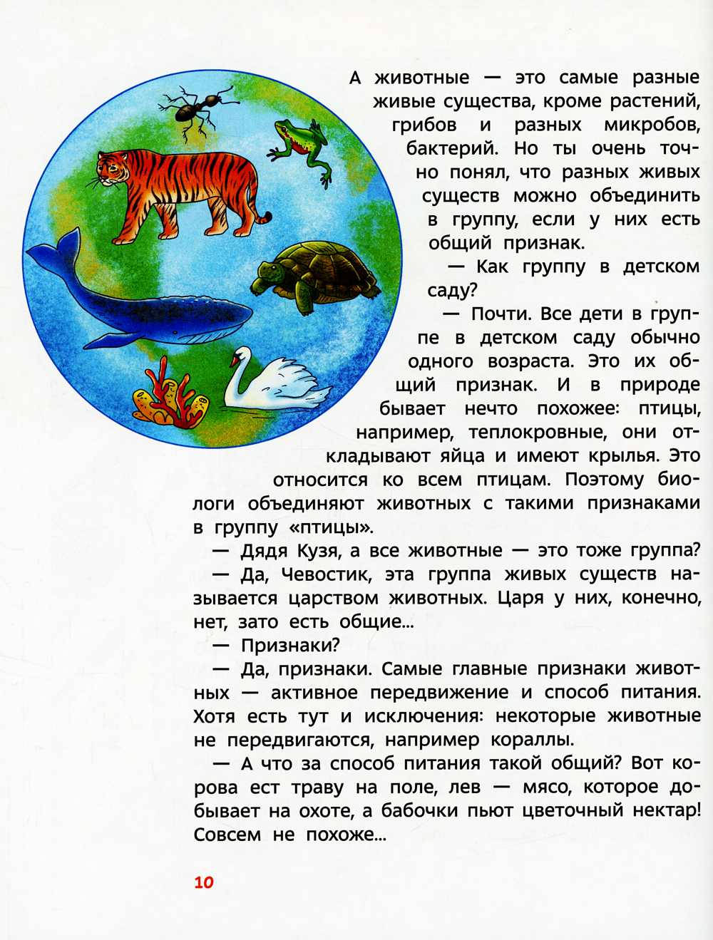 В новой книге серии детских энциклопедий Чевостик и дядя Кузя узнают много нового о животном мире. Сначала они отправятся в глубокую древность и понаблюдают, как менялась жизнь на протяжении миллиардов лет. А потом герои вернутся в наши дни, облетят всю Землю и изучат рыб, насекомых, птиц и млекопитающих. Побывают на суше и в океане, в Антарктиде и в Африке, научаются различать одноклеточных, позвоночных и беспозвоночных животных и познакомятся с удивительной наукой - зоологией.