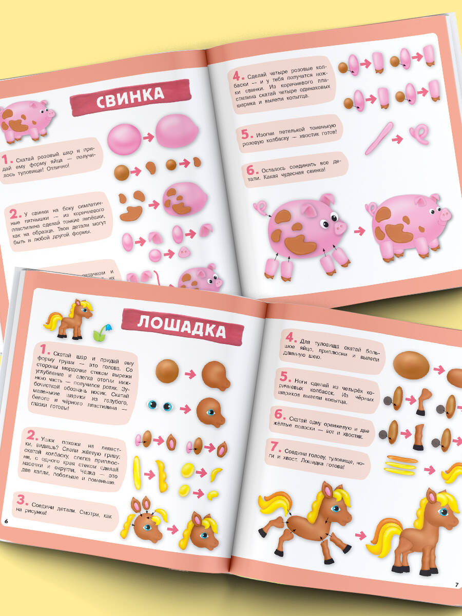 Малыши слепят из пластилина животных и их детёнышей: лошадку и жеребёнка, овечку и ягнёнка, свинку и поросёнка, козу и козлёнка, корову и телёнка, индюшку и индюшонка, петушка и цыплят. Подробно описан процесс лепки: есть пошаговая инструкция и поясняющие рисунки. Интерактивная книжка-мастерилка: можно создавать целые пластилиновые сценки со зверятами. Удовольствие и положительные эмоции гарантированы!| Издательство | ИЗДАТЕЛЬСТВО "АСТ" |