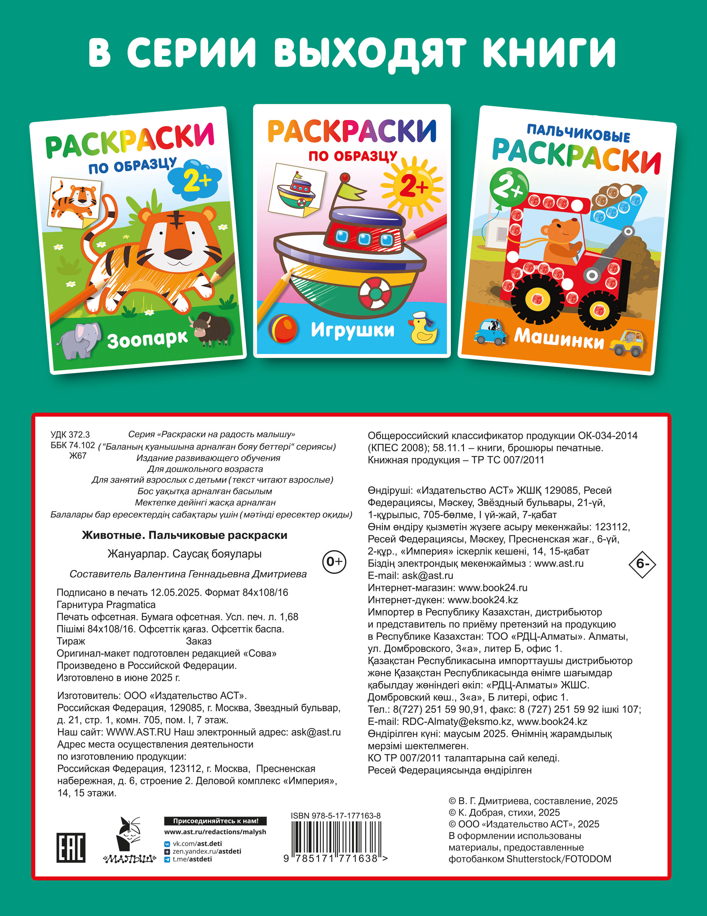«Животные. Пальчиковые раскраски» - всё для запуска речи и развития мелкой моторики: широкий цветной контур + пальчиковое рисование + весёлые, лёгкие в запоминании стихи. Новая книга серии «Раскраски на радость малышу» создана специально для раннего развития ребёнка. Через плотную бумагу не просвечивают даже самые яркие краски. Широкий цветной контур подскажет ребёнку, каким цветом можно раскрасить картинку, а пальчиковое рисование сделает процесс не только весёлым, но и полезным: малыш будет развивать тактильную чувствительность, мелкую моторику, воображение и образное мышление, исследовать на ощупь текстуру бумаги и красок - идеально для запуска речи малыша. Во время занятия ребёнок: • учится проявлять инициативу; • знакомится с окружающим миром, формирует познавательный интерес; • приобретает представление о предметах, их цвете, форме и размере; • тренирует память, концентрацию внимания; • развивает художественное восприятие. Яркие эмоции, радость от творчества и гордость за свои маленькие шедевры - с этой книгой каждый день будет наполнен открытиями! Подарите вашему ребёнку возможность учиться и развиваться через игру - выбирайте «Животные. Пальчиковые раскраски» уже сегодня!| Издательство | Издательство "АСТ" |