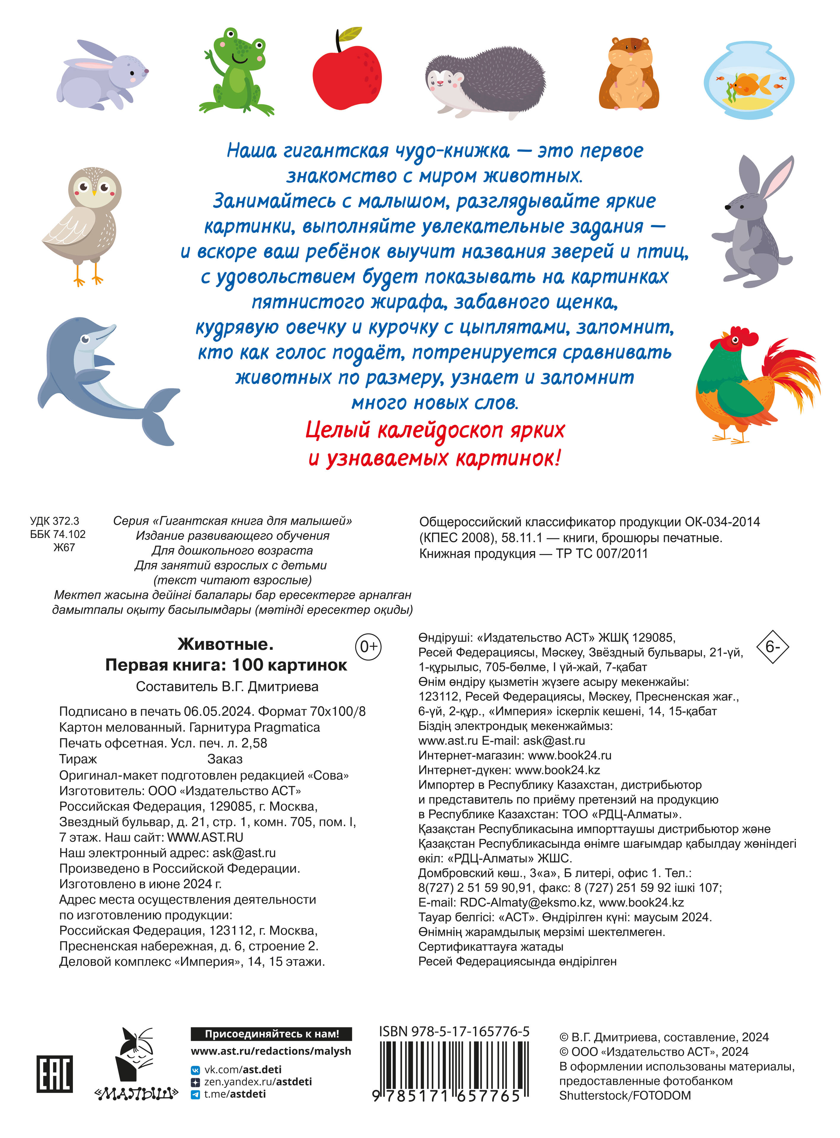 Прекрасно иллюстрированная подарочная книга о животных создана специально для самых маленьких. На каждой странице - крупные, красивые, добрые картинки. Узнавать и запоминать животных на картинках - легко и интересно. Малыш познакомится с домашними питомцами, жителями фермы и птичьего двора, лесными и морскими животными, обитателями зоопарка. Гигантского размера книга прослужит долго - она выполнена из плотного и долговечного картона. Страницы имеют закруглённые края, поэтому безопасны для малыша. Развивающие вопросы и задания способствуют запуску речи. Играя с книжкой, ребёнок разовьёт воображение, мелкую моторику, внимание, память, логическое и абстрактное мышление. Пусть малыш играет, читает, узнаёт новое!| Издательство | Издательство "АСТ" |