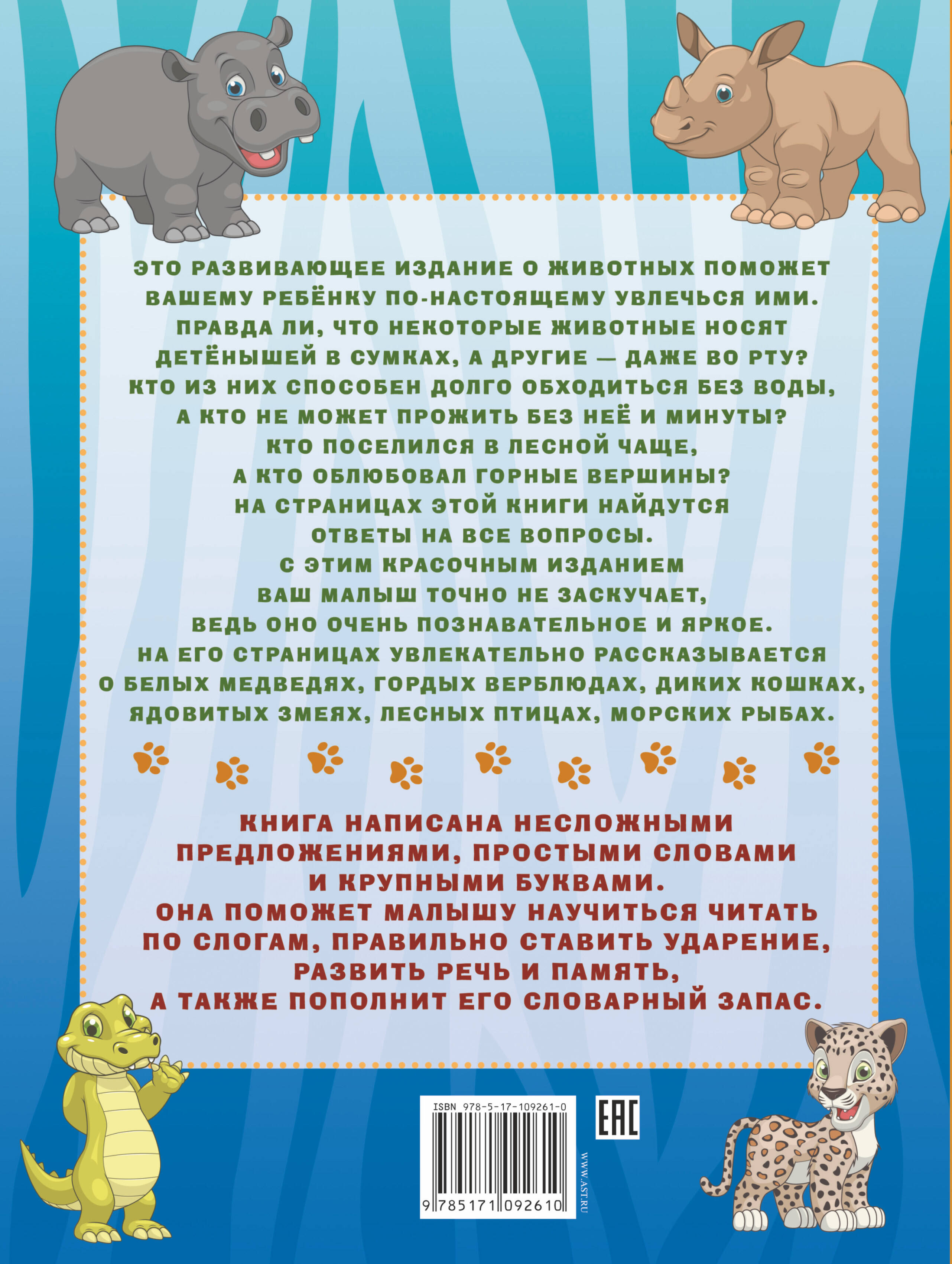 Самое время отправиться со своим малышом в гости к братьям нашим меньшим. Забавным, непоседливым, грозным, таинственным - очень разным, но во многом похожим на нас. Книга с крупными буквами "Животные" расскажет не только о живущих в наших широтах колючих ёжиках, бурых мишках, хитрых лисичках, зубастых волках и серых зайчиках, но и о тех животных, кого не встретишь в нашем лесу, кто обитает на льдинах, в пустынях, горах, пещерах, морях и океанах. Книги о животных незаменимы для детей. Они учат понимать, ценить и уважать природу, заботиться о зверятах и дружить с ними. Это издание не является исключением. Оно увлекательно и познавательно расскажет о самых разных животных планеты, в картинках покажет, какие они интересные и замечательные. Но одновременно эта книга особенная. Она для тех, кто только начинает глубоко познавать окружающий мир, учится читать и запоминать. Книга написана понятным языком, несложными предложениями, крупными буквами. С нашим изданием ваш ребёнок научится читать по слогам, правильно произносить слова и обязательно захочет почитать ещё! Для дошкольного возраста.| Издательство | ИЗДАТЕЛЬСТВО "АСТ" |