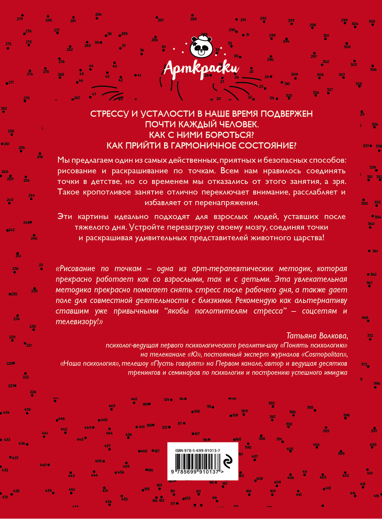 О чем эта книга Новая серия «Арт-терапия. От точки к точке» - это часы спокойствия и релаксации после тяжелого дня, это отдых и перезагрузка для мозга. Откройте любую страницу, возьмите ручку и просто соединяйте точки, и вскоре вы почувствуете, что усталость прошла. Этот вид терапии для взрослых уже получил популярность и признание во всем мире, предлагаем и вам ощутить на себе его удивительное терапевтическое воздействие. Для кого эта книга Для тех, кто хочет отдохнуть после тяжелого дня и расслабиться. Фишки книги Самый безвредный антистресс. Настоящие чудеса света внутри! Отзыв «Рисование по точкам - одна из арт-терапевтических методик, которая прекрасно работает как со взрослыми, так и с детьми. Эта увлекательная методика прекрасно помогает снять стресс после рабочего дня, а также дает поле для совместной деятельности с близкими. Рекомендую как альтернативу ставшим уже привычными "якобы поглотителями стресса" соцсетям и телевизору!» - Татьяна Волкова, психолог, психотерапевт| Издательство | ООО "Издательство "Эксмо" |