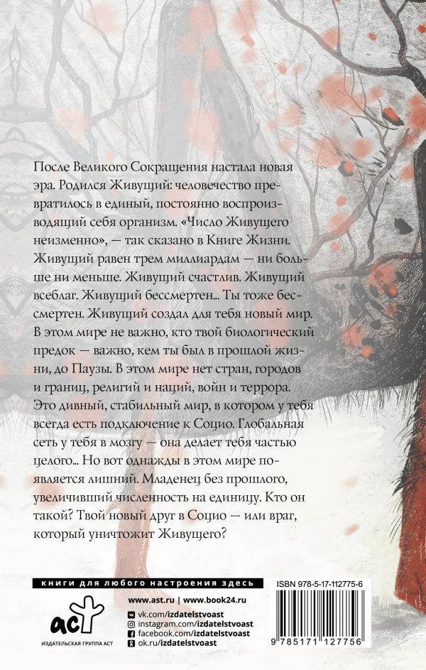После Великого Сокращения настала новая эра. Родился Живущий: человечество превратилось в единый, постоянно воспроизводящий себя организм. «Число Живущего неизменно», - так сказано в Книге Жизни. Живущий равен трем миллиардам - ни больше, ни меньше. Живущий счастлив. Живущий всеблаг. Живущий бессмертен... Ты тоже бессмертен. Живущий создал для тебя новый мир. В этом мире не важно, кто твой биологический предок - важно, кем ты был в прошлой жизни, до Паузы. В этом мире нет стран, городов и границ, религий и наций, войн и террора. Это дивный, стабильный мир, в котором у тебя всегда есть подключение к Социо. Глобальная сеть у тебя в мозгу - она делает тебя частью целого... Но вот однажды в этом мире появляется лишний. Младенец без прошлого, увеличивший численность на единицу. Кто он такой? Твой новый друг в Социо - или враг, который уничтожит Живущего?