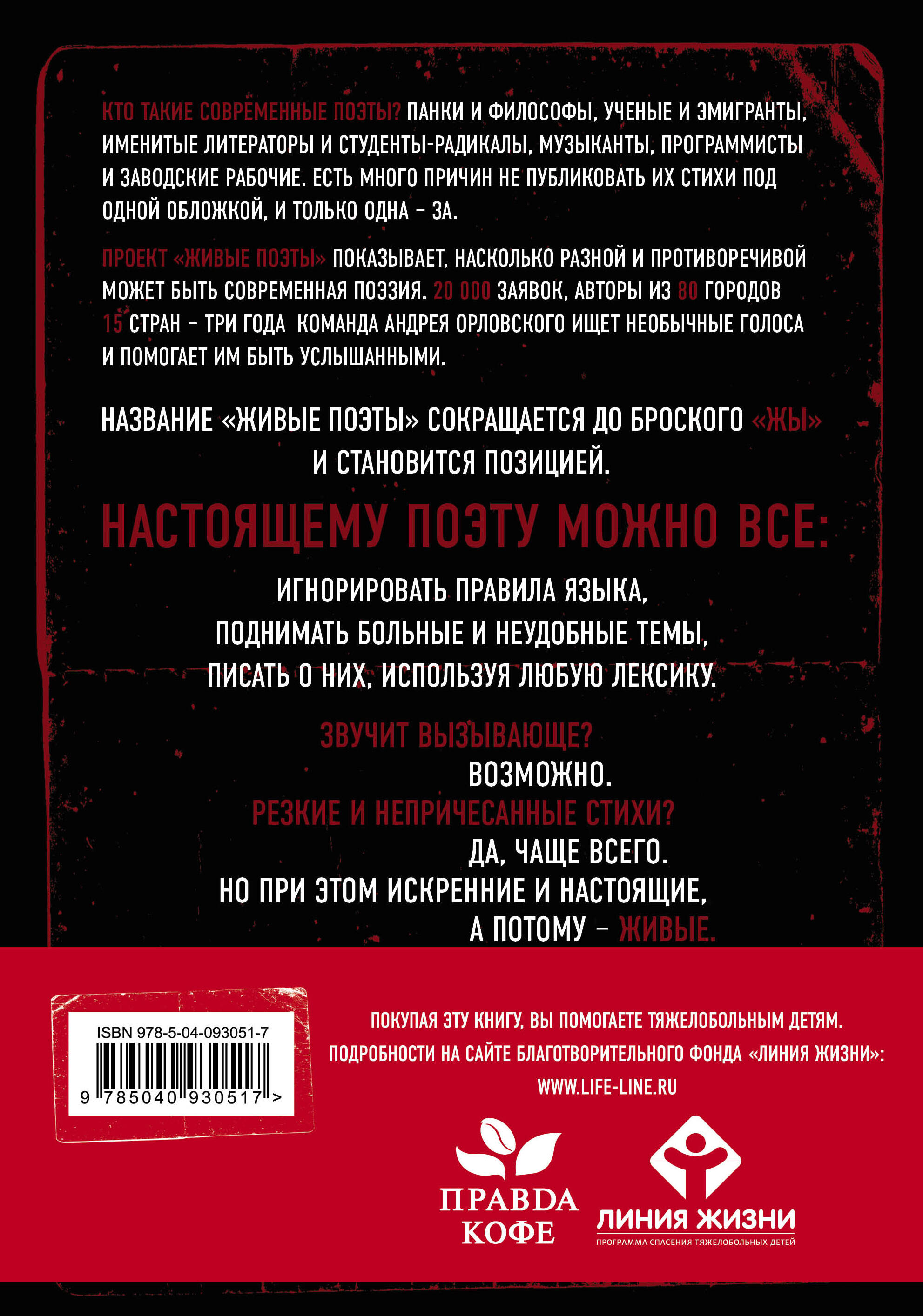 Кто такие современные поэты? Панки и философы, ученые и эмигранты, именитые литераторы и студенты-радикалы, музыканты, программисты и заводские рабочие. Есть много аргументов против публикации их стихов под одной обложкой. И только один - за. Проект «Живые поэты» показывает, насколько разной и противоречивой может быть современная поэзия. 20 000 заявок, авторы из 80 городов 15 стран - три года команда Андрея Орловского ищет необычные голоса и помогает им быть услышанными. Название «Живые поэты» сокращается до броского «ЖЫ» и становится позицией. Настоящему поэту можно все: игнорировать правила языка, поднимать больные и неудобные темы, писать о них, используя любую лексику. Звучит вызывающе? - Возможно. Резкие и непричесанные стихи? - Да, чаще всего. Но при этом искренние и настоящие, а потому - живые.| Издательство | ООО "Издательство "Эксмо" |
