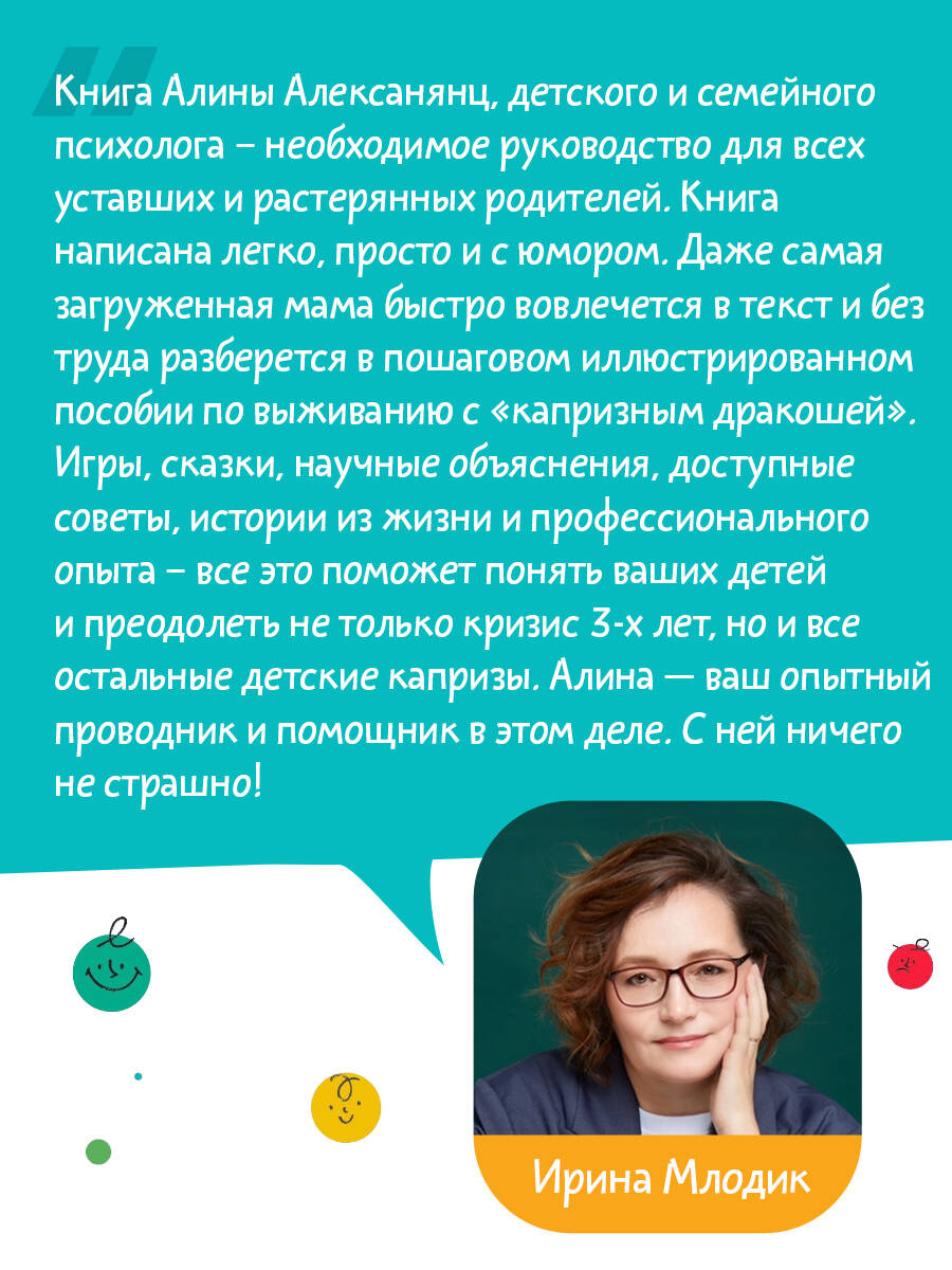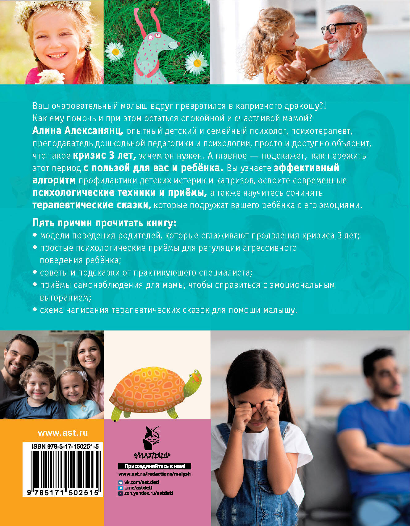 «Не хочу!», «Не буду!», «Я сам!». Ваш очаровательный малыш вдруг превратился в капризного дракошу?! Что случилось? Как ему помочь и при этом остаться спокойной и счастливой мамой? Алина Алексанянц, опытный детский и семейный психолог, психотерапевт, преподаватель дошкольной педагогики и психологии, просто и доступно объяснит, что такое кризис 3 лет, зачем он нужен. А главное - подскажет, как пережить это период с пользой для вас и ребёнка. Вы узнаете эффективный алгоритм профилактики детских истерик и капризов, освоите современные психологические техники и приёмы, а также научитесь сочинять терапевтические сказки, которые подружат вашего ребёнка с его эмоциями.| Издательство | ИЗДАТЕЛЬСТВО "АСТ" |