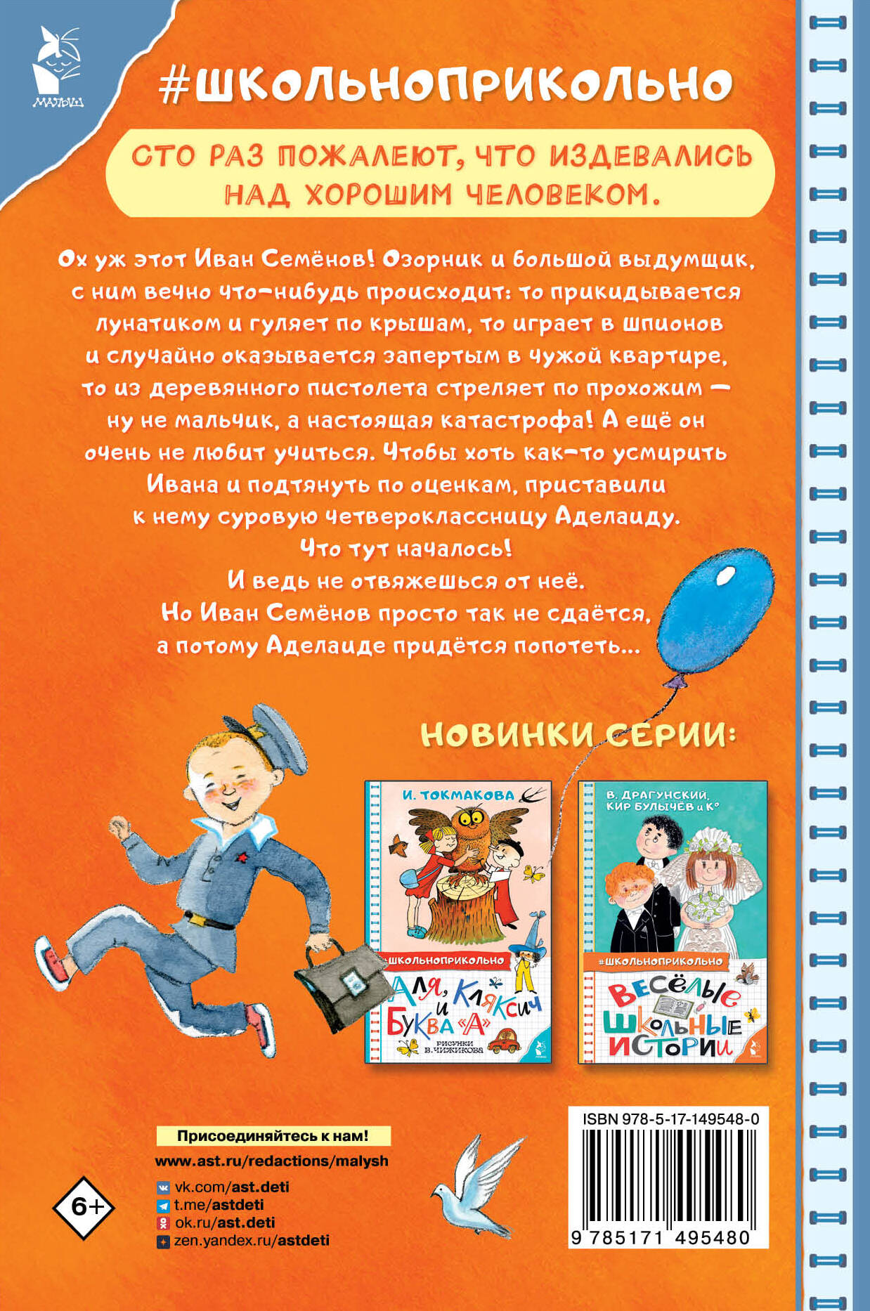 Ох уж этот Иван Семёнов! Озорник и большой выдумщик, с ним вечно что-нибудь происходит: то прикидывается лунатиком и гуляет по крышам, то играет в шпионов и случайно оказывается запертым в чужой квартире, то из деревянного пистолета стреляет по прохожим - ну не мальчик, а настоящая катастрофа! А ещё он очень не любит учиться. Чтобы хоть как-то усмирить Ивана и подтянуть по оценкам, приставили к нему суровую четвероклассницу Аделаиду. Что тут началось! И ведь не отвяжешься от неё. Но Иван Семёнов просто так не сдаётся, а потому Аделаиде придётся попотеть…| Издательство | АСТ |