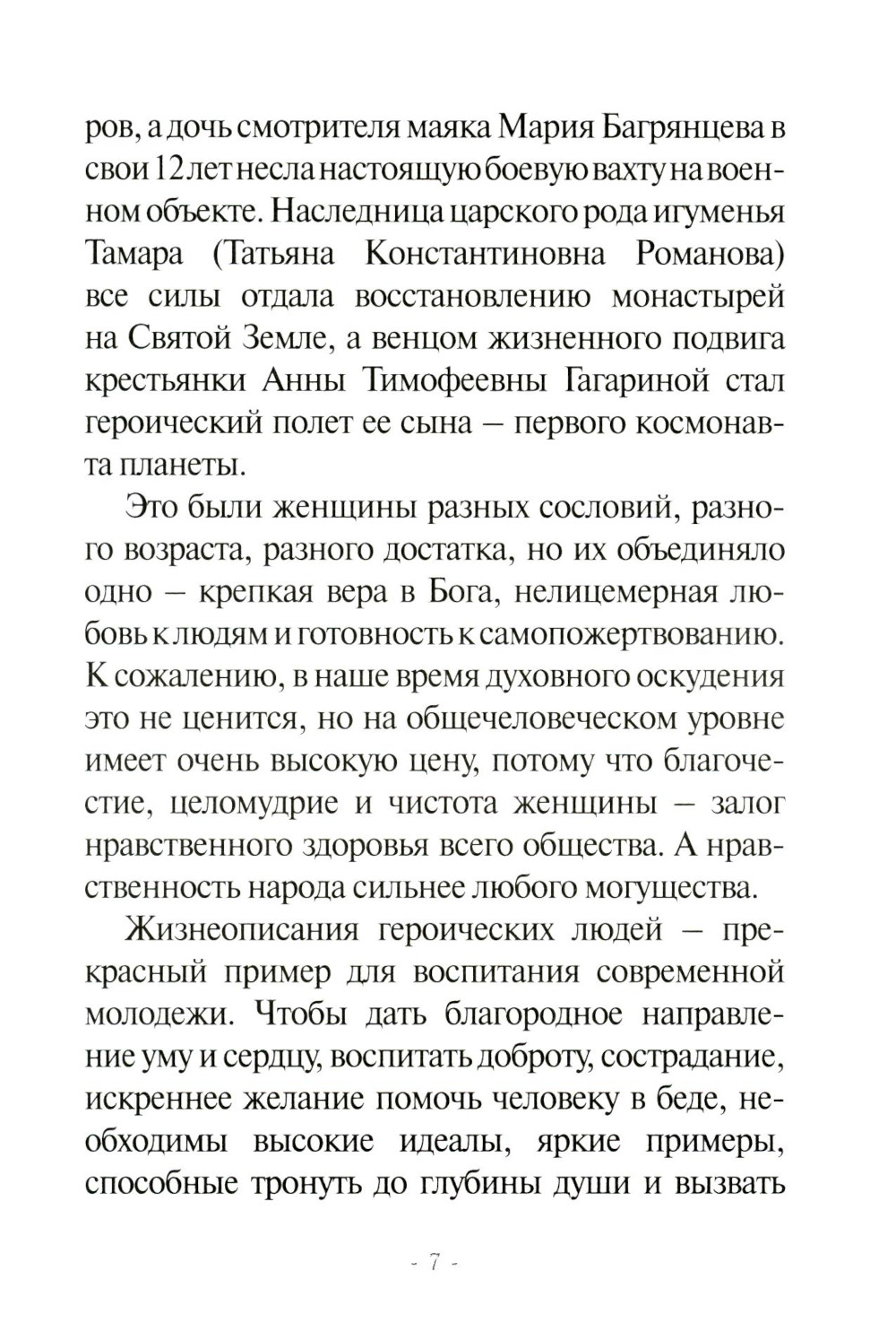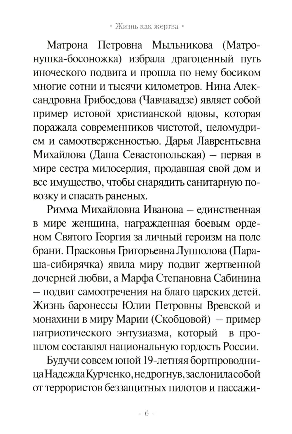 Особые страницы русской истории связаны с жертвенным служением женщин. В русской женщине воедино слиты материнская нежность, дочерняя преданность, христианское самоотречение и гражданская отвага. Авдотья Рязаночка, Нина Грибоедова, игумения Тамара (Короченцова), Василиса Кожина, монахиня Мария (Скобцова), Надежда Курченко, Даша Севастопольская, Анна Тимофеевна Гагарина - это были женщины разных сословий, разного возраста, разного достатка, но их объединяло одно - крепкая вера в Бога, нелицемерная любовь к людям и готовность к самопожертвованию. А настоящая любовь - это в первую очередь готовность любящего пожертвовать собой ради блага любимого. Но как же еще научиться любить по-настоящему, если не на примерах наших великих соотечественниц, которые исполнили главную Божию заповедь - заповедь любви, ибо Господь сказал, что нет больше той любви, как кто свою жизнь положит за своих друзей.| Издательство | Тренды и традиции |