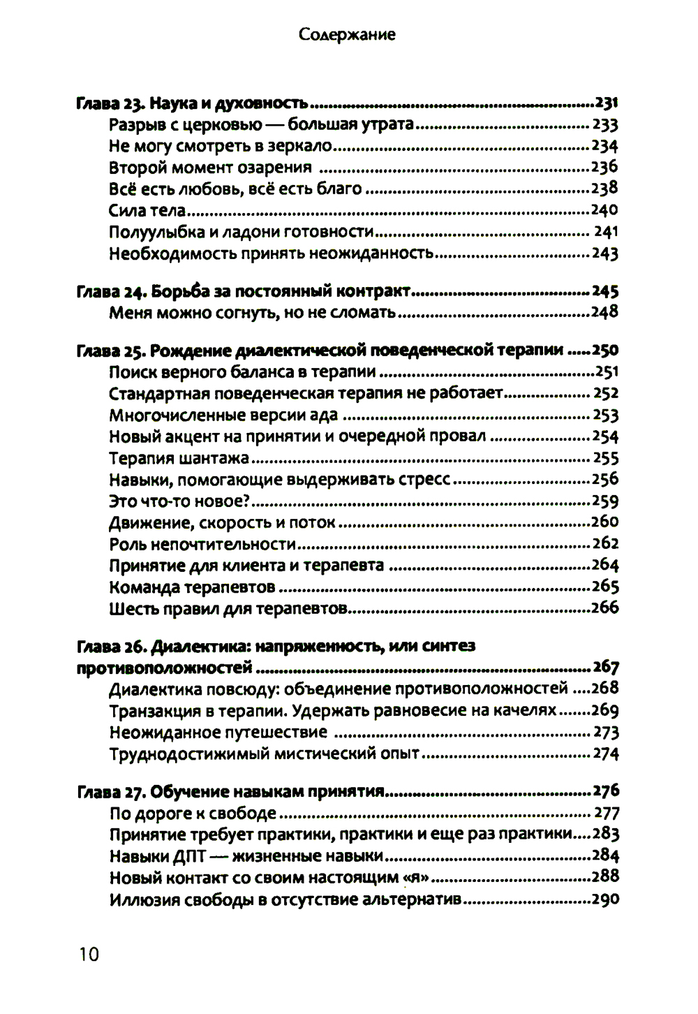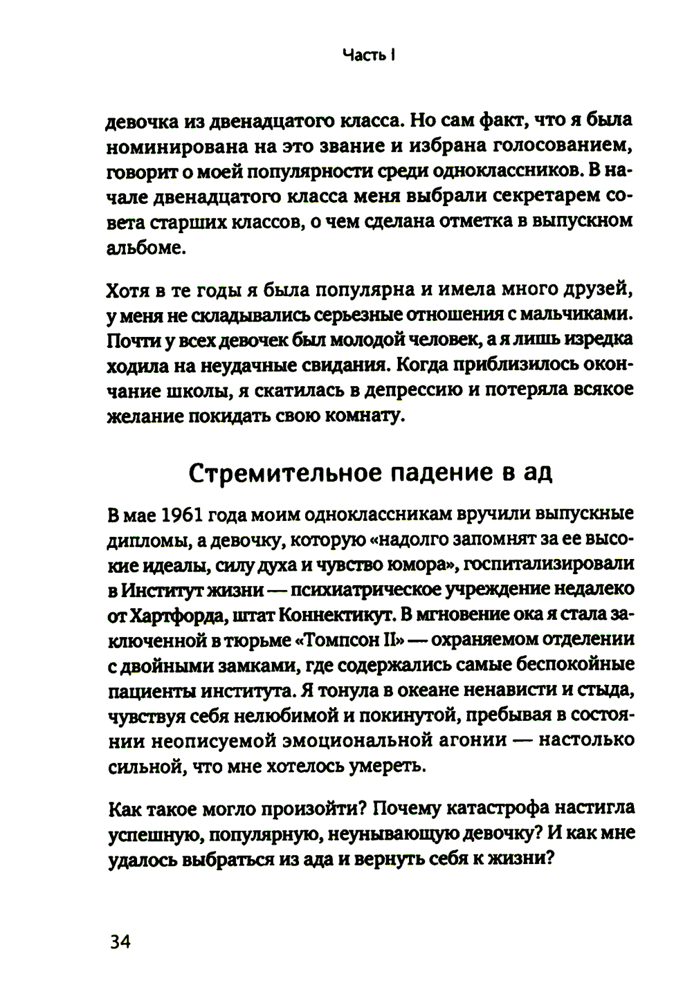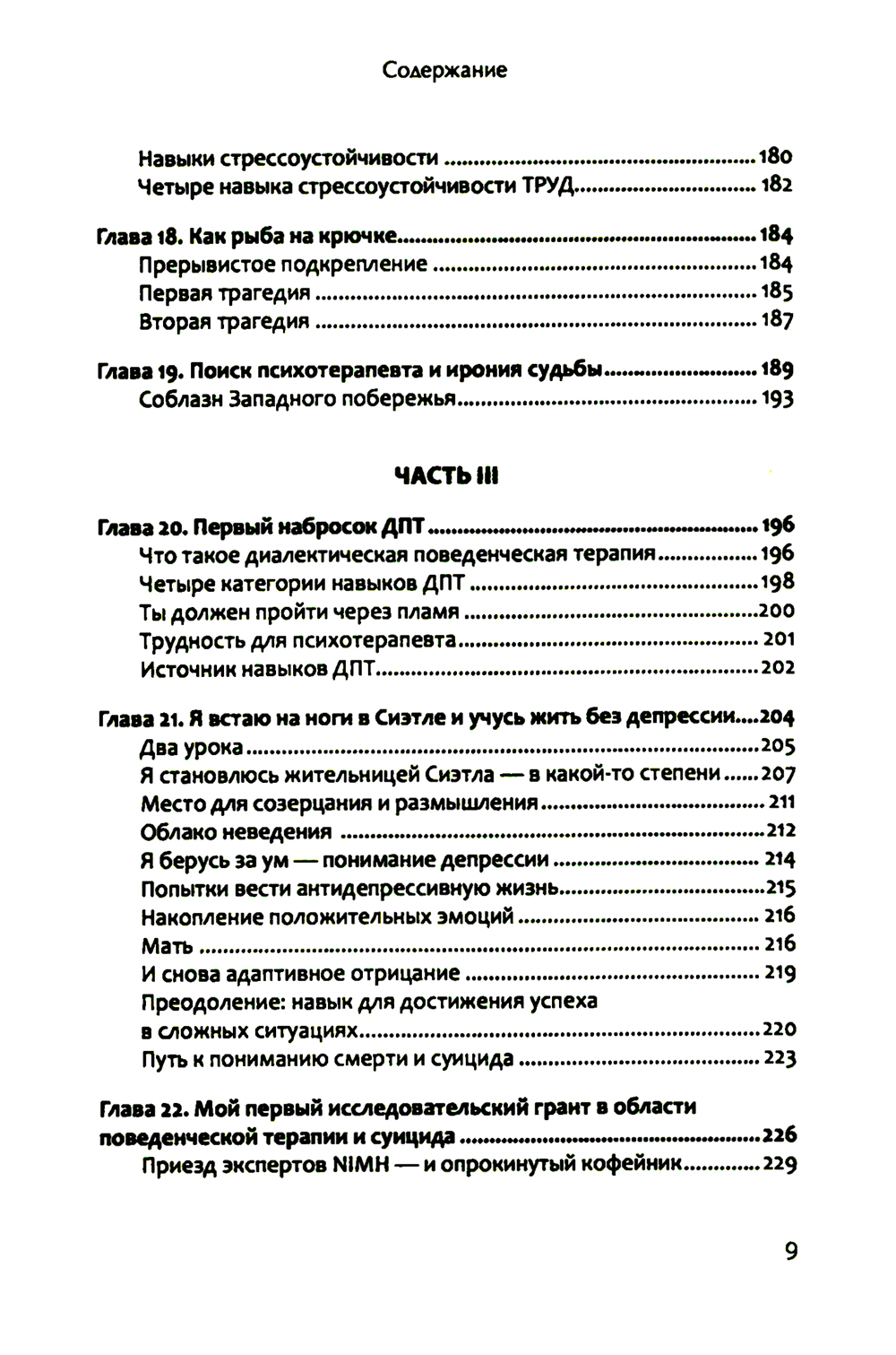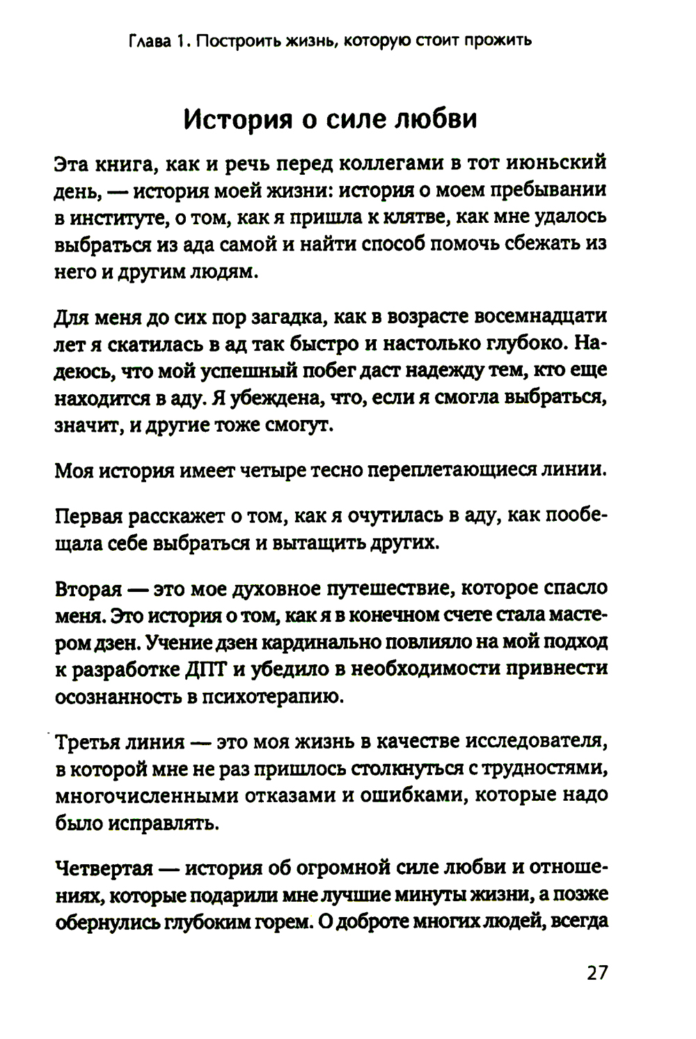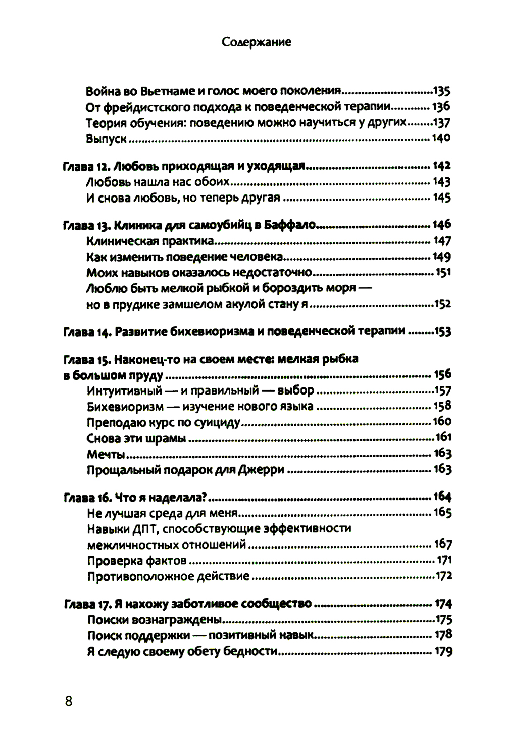 Разработанная ею диалектическая поведенческая терапия спасла жизни огромного числа людей, склонных к депрессии и суициду, людей с пограничным расстройством личности и другими тяжелыми психическими расстройствами. Однако доктор Линехан никогда не рассказывала, что ее новаторская работа неотделима от се собственной истории. В ранней молодости Марша поклялась, что если ей удастся выбраться из ада, в который превратилась се жизнь, то она приложит все усилия, чтобы помочь выбраться и другим. Она сдержала обещание, пройдя путь от девушки, запертой в психушке, до всемирно известного создателя терапии. Линехан учит людей тому, что каждый человек, какой бы невыносимой не была его жизненная ситуация, может построить жизнь, достойную проживания.| Издательство | Питер |