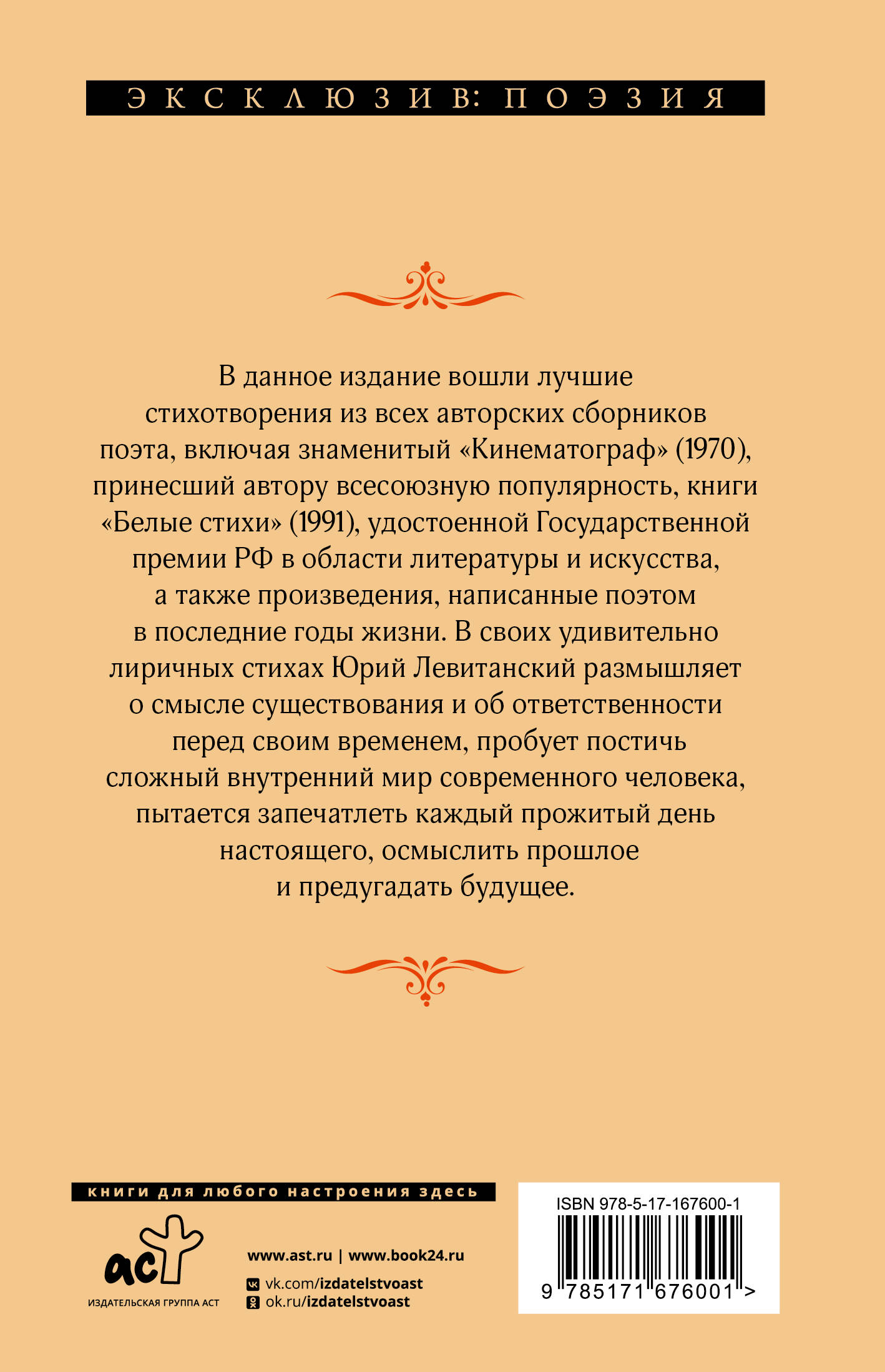 В данное издание вошли лучшие стихотворения из всех авторских сборников поэта, включая знаменитый "Кинематограф" (1970), принесший автору всесоюзную популярность, книги "Белые стихи" (1991), удостоенной Государственной премии РФ в области литературы и искусства, а также произведения, написанные поэтом в последние годы жизни. В своих удивительно лиричных стихах Юрий Левитанский размышляет о смысле существования и об ответственности перед своим временем, пробует постичь сложный внутренний мир современного человека, пытается запечатлеть каждый прожитый день настоящего, осмыслить прошлое и предугадать будущее.| Издательство | Издательство "АСТ" |