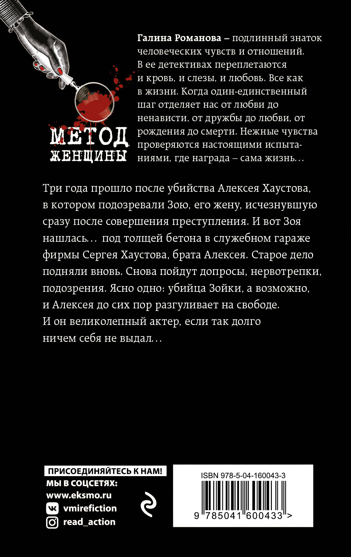 Три года прошло после убийства Алексея Хаустова, в котором подозревали Зою, его жену, исчезнувшую сразу после совершения преступления. И вот Зоя нашлась… под толщей бетона в служебном гараже фирмы Сергея Хаустова, брата Алексея. Старое дело подняли вновь. Снова пойдут допросы, нервотрепки, подозрения. Ясно одно - убийца Зойки, а, возможно, и Алексея, до сих пор разгуливает на свободе. И он великолепный актер, если так долго ничем себя не выдал… В детективных мелодрамах Галины Романовой переплелись и кровь, и слезы, и любовь. Всё, как в жизни! Нежные чувства проверяются настоящими испытаниями, где награда - сама жизнь. Каждая история по-своему уникальна и не кажется вымыслом! И все они объединены общей темой: настоящая любовь всегда побеждает, а за преступлением непременно следует наказание.| Издательство | Эксмо |