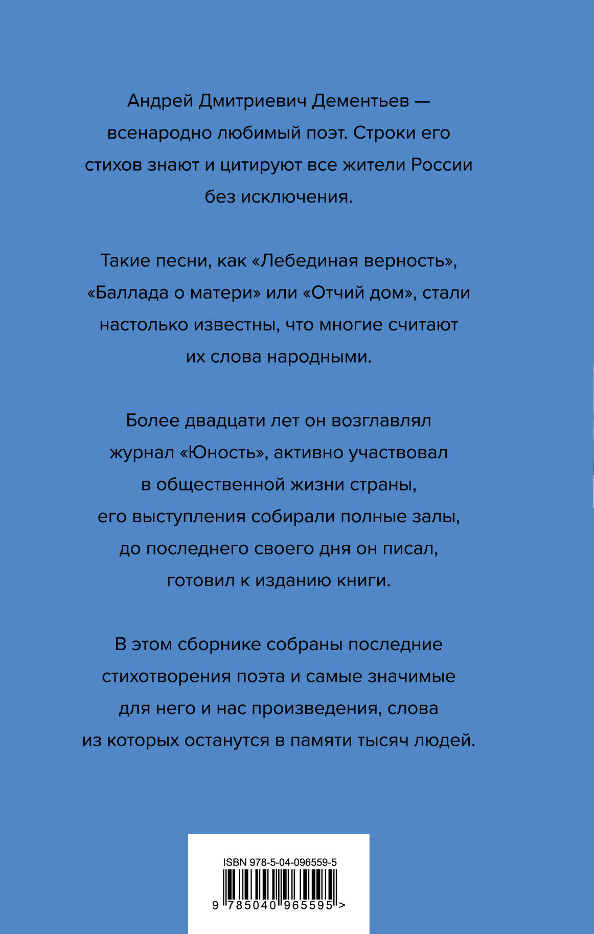 Известный русский поэт Андрей Дементьев - один из самых читаемых и любимых российских авторов. Его стихотворения подкупают искренностью и проникновенностью, а читатели искренне ценят доброту и высоконравственность лирического героя поэзии Андрея Дементьева. На стихи Дементьева написаны десятки известных песен, таких как «Лебединая верность», «Отчий дом», «Яблоки на снегу», «Аленушка», «Натали» и «Каскадеры», а произведения поэта переведены на многие языки мира.| Издательство | ООО "Издательство "Эксмо" |