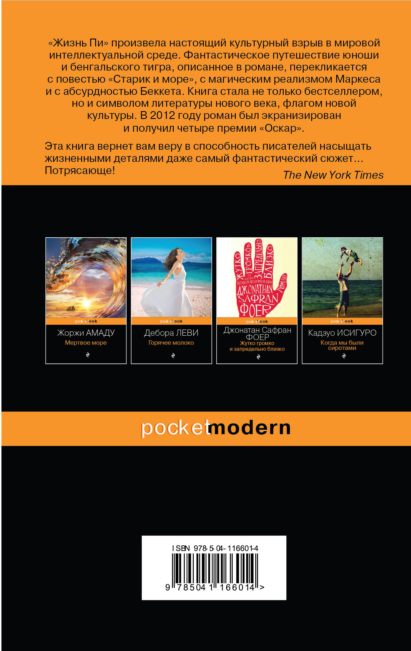 «Жизнь Пи» - роман - лауреат Букеровской премии 2002 года, написан о путешествии не кого-нибудь, а маленького индуса и... бенгальского тигра! И не где-нибудь, а в шлюпке посреди Тихого океана! «Жуткое, абсурдное, рискованное, печальное и необыкновенно чувственное по части воспроизводимых образов и запахов, это путешествие и его донельзя чудной рассказчик (похожий на интеллектуальную колибри, вынужденную извлекать нектар из глубин самых разных соцветий) напоминают галлюциноз Джозефа Конрада и Салмана Рушди, гадающих о смысловой начинке "Старика и моря" и "Гулливера"». - The Financial Times «Эта книга вернет вам веру в способность писателей насыщать жизненными деталями даже самый фантастический сюжет... Потрясающе!» - The New York Times «Жизнь Пи» произвела настоящий культурный взрыв в мировой интеллектуальной среде. Фантастическое путешествие юноши и бенгальского тигра, описанное в романе, перекликается с повестью «Старик и море», с магическим реализмом Маркеса и с абсурдностью Беккета. Книга стала не только бестселлером, но и символом литературы нового века, флагом новой культуры. В 2012 году роман был экранизирован и получил четыре премии «Оскар».| Издательство | ООО "Издательство "Эксмо" |
