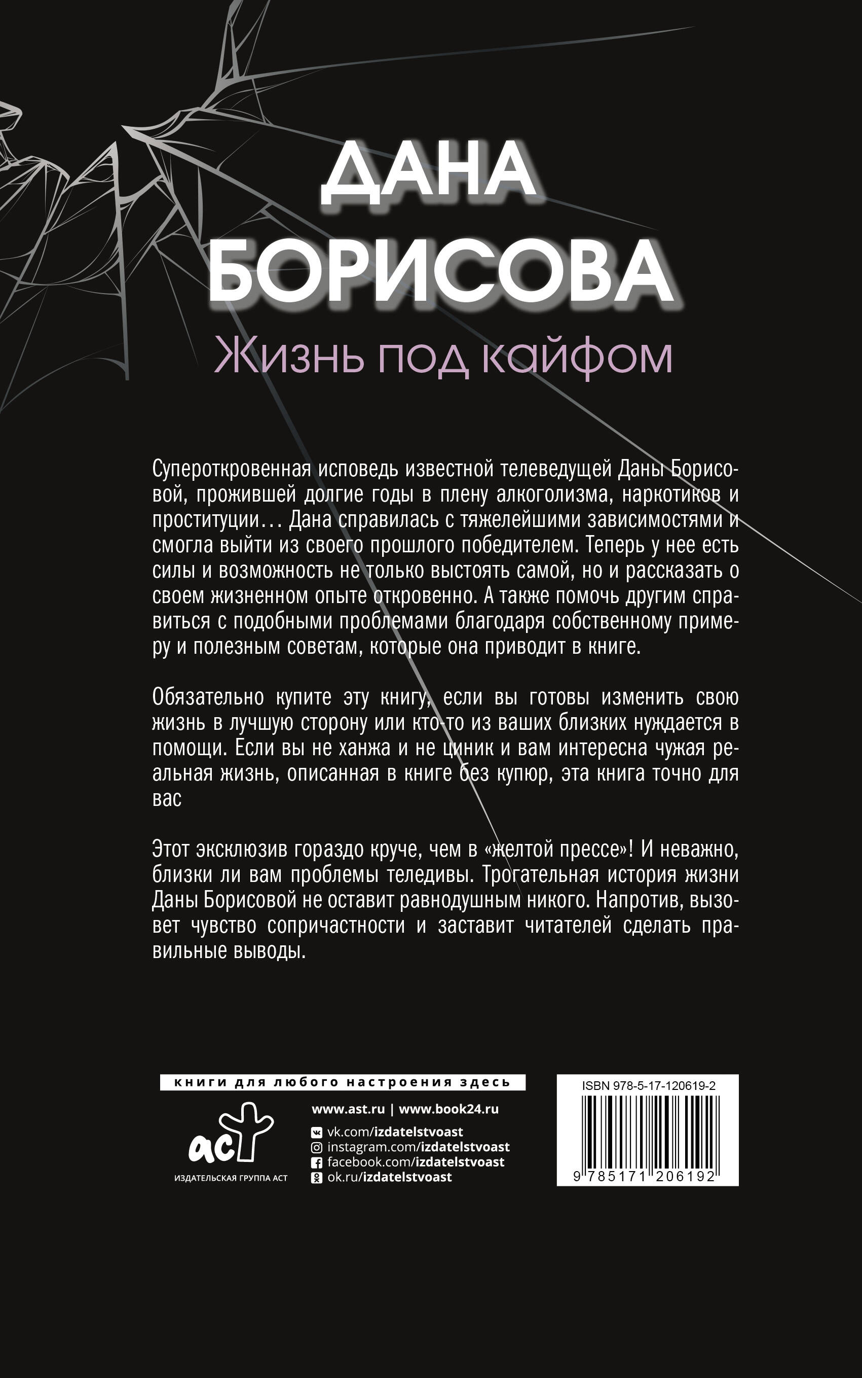 В своей книге известная телеведущая Дана Борисова рассказывает шокирующие факты о себе и окружающих людях. Это супероткровенная исповедь прожившей долгие годы в плену алкоголизма, наркотиков и проституции… Дана справилась с тяжелейшими зависимостями и смогла выйти из своего прошлого победителем. Теперь у нее есть силы и возможность не только выстоять самой, но и рассказать о своем жизненном опыте откровенно, чтобы помочь другим справиться с подобными проблемами, благодаря собственному примеру и полезным советам, которые она приводит в книге. Обязательно купите эту книгу, если вы готовы изменить свою жизнь в лучшую сторону, последовав примеру автора, если вы - не ханжа и не циник, и вам интересна чужая реальная жизнь, описанная в книге без купюр, в разговорном жанре, доступном каждому и умышленно не приукрашенная литературно, чтобы сохранить оригинальный авторский стиль. Поверьте, этот эксклюзив гораздо круче, чем в «желтой прессе»! И неважно, близки ли вам проблемы теледивы. Трогательная история жизни Даны Борисовой не оставит равнодушным никого. Напротив, вызовет чувство сопричастности и заставит читателей сделать правильные выводы.| Издательство | ИЗДАТЕЛЬСТВО "АСТ" |
