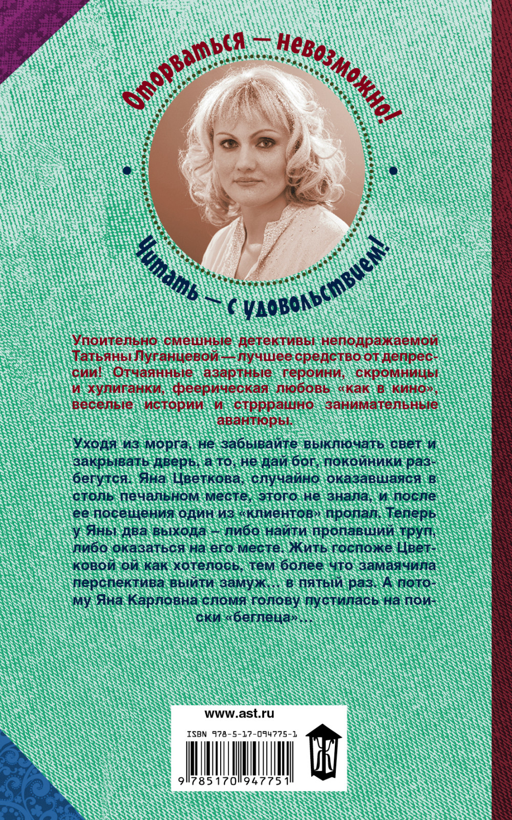 Уходя из морга, не забывайте выключать свет и закрывать дверь, а то, не дай бог, покойники разбегутся. Яна Цветкова, случайно оказавшаяся в столь печальном месте, этого не знала, и после ее посещения один из «клиентов» пропал. Теперь у Яны два выхода - либо найти пропавший труп, либо оказаться на его месте. Жить госпоже Цветковой ой как хотелось, тем более что замаячила перспектива выйти замуж в пятый раз. А потому Яна Карловна, сломя голову, пустилась на поиски «беглеца»…