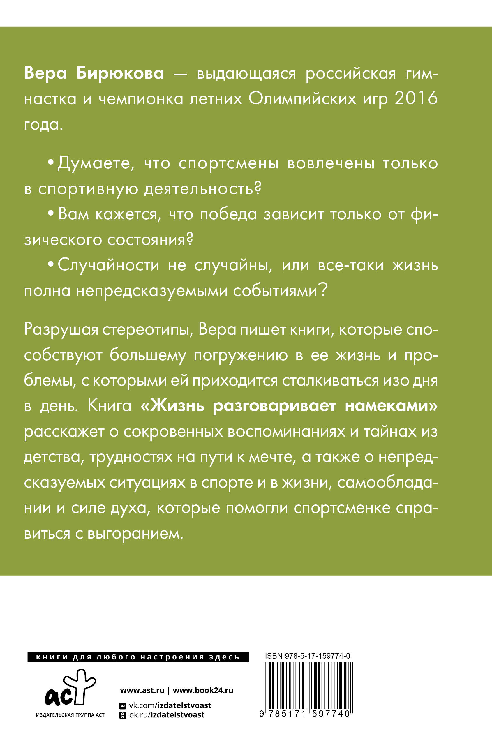 Разрушая стереотипы, Вера пишет книги, которые способствуют большему погружению в ее жизнь и проблемы, с которыми ей приходится сталкиваться изо дня в день. Книга "Жизнь намеками" расскажет о сокровенных воспоминаниях и тайнах из детства, трудностях на пути к мечте, а также о непредсказуемых ситуациях в спорте и в жизни, самообладании и силе духа, которые помогли спортсменке справиться с выгоранием. "Жизнь - это не механический процесс, и она никак не может быть безопасной. Это непредсказуемая история, никто не знает, что случится наперед, и она никак не может быть безопасной". "Как бы всё ни было плохо, можно сделать хуже". Вы же понимаете, о чём речь? Нужно бороться до конца".| Издательство | Издательство "АСТ" |