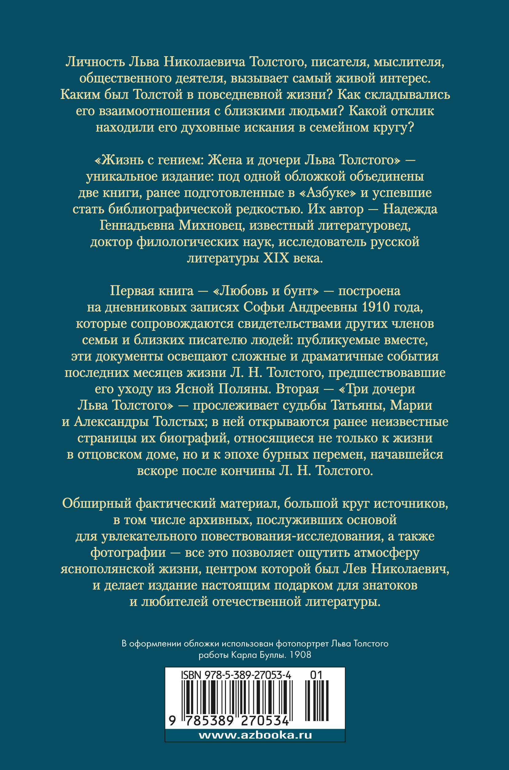 Личность Льва Николаевича Толстого, писателя, мыслителя, общественного деятеля, вызывает самый живой интерес. Каким был Толстой в повседневной жизни? Как складывались его взаимоотношения с близкими людьми? Какой отклик находили его духовные искания в семейном кругу? "Жизнь с гением: Жена и дочери Льва Толстого" - уникальное издание: под одной обложкой объединены две книги, ранее подготовленные в "Азбуке" и успевшие стать библиографической редкостью. Их автор - Надежда Геннадьевна Михновец, известный литературовед, доктор филологических наук, исследователь русской литературы XIX века. Первая книга - "Любовь и бунт" - построена на дневниковых записях Софьи Андреевны 1910 года, которые сопровождаются свидетельствами других членов семьи и близких писателю людей: публикуемые вместе, эти документы освещают сложные и драматичные события последних месяцев жизни Л. Н. Толстого, предшествовавшие его уходу из Ясной Поляны. Вторая - "Три дочери Льва Толстого" - прослеживает судьбы Татьяны, Марии и Александры Толстых; в ней открываются ранее неизвестные страницы их биографий, относящиеся не только к жизни в отцовском доме, но и к эпохе бурных перемен, начавшейся вскоре после кончины Л. Н. Толстого. Обширный фактический материал, большой круг источников, в том числе архивных, послуживших основой для увлекательного повествования-исследования, а также фотографии - все это позволяет ощутить атмосферу яснополянской жизни, центром которой был Лев Николаевич, и делает издание настоящим подарком для знатоков и любителей отечественной литературы.| Издательство | Азбука-Аттикус Издат.группа ООО |