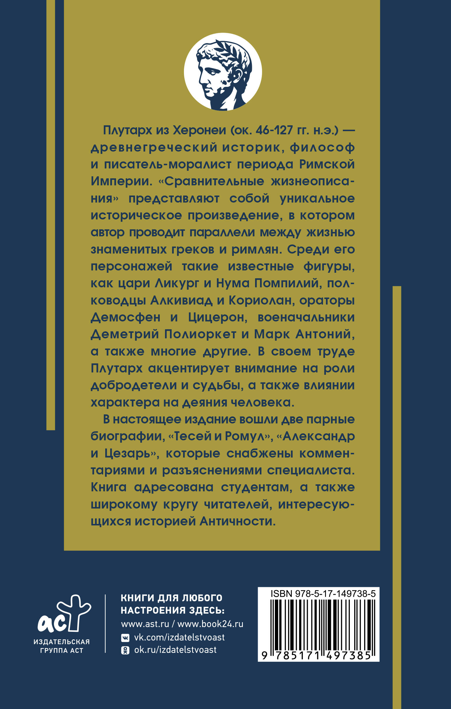 Плутарх из Херонеи (ок. 46-127 гг. н.э.) - древнегреческий сторик, философ и писатель-моралист периода Римской Империи. "Сравнительные жизнеописания" представляют собой уникальное историческое произведение, в котором автор проводит параллели между жизнью знаменитых греков и римлян. Среди его персонажей такие известные фигуры, как цари Ликург и Нума Помпилий, полководцы Алкивиад и Кориолан, ораторы Демосфен и Цицерон, военачальники Деметрий Полиоркет и Марк Антоний, а также многие другие. В своем труде Плутарх акцентирует внимание на роли обродетели и судьбы, а также влиянии характера на деяния человека. В настоящее издание вошли две парные биографии, "Тесей и Ромул", "Александр и Цезарь", которые снабжены комментариями и разъяснениями специалиста. Книга адресована студентам, а также широкому кругу читателей, интересующихся историей Античности.| Издательство | Издательство "АСТ" |
