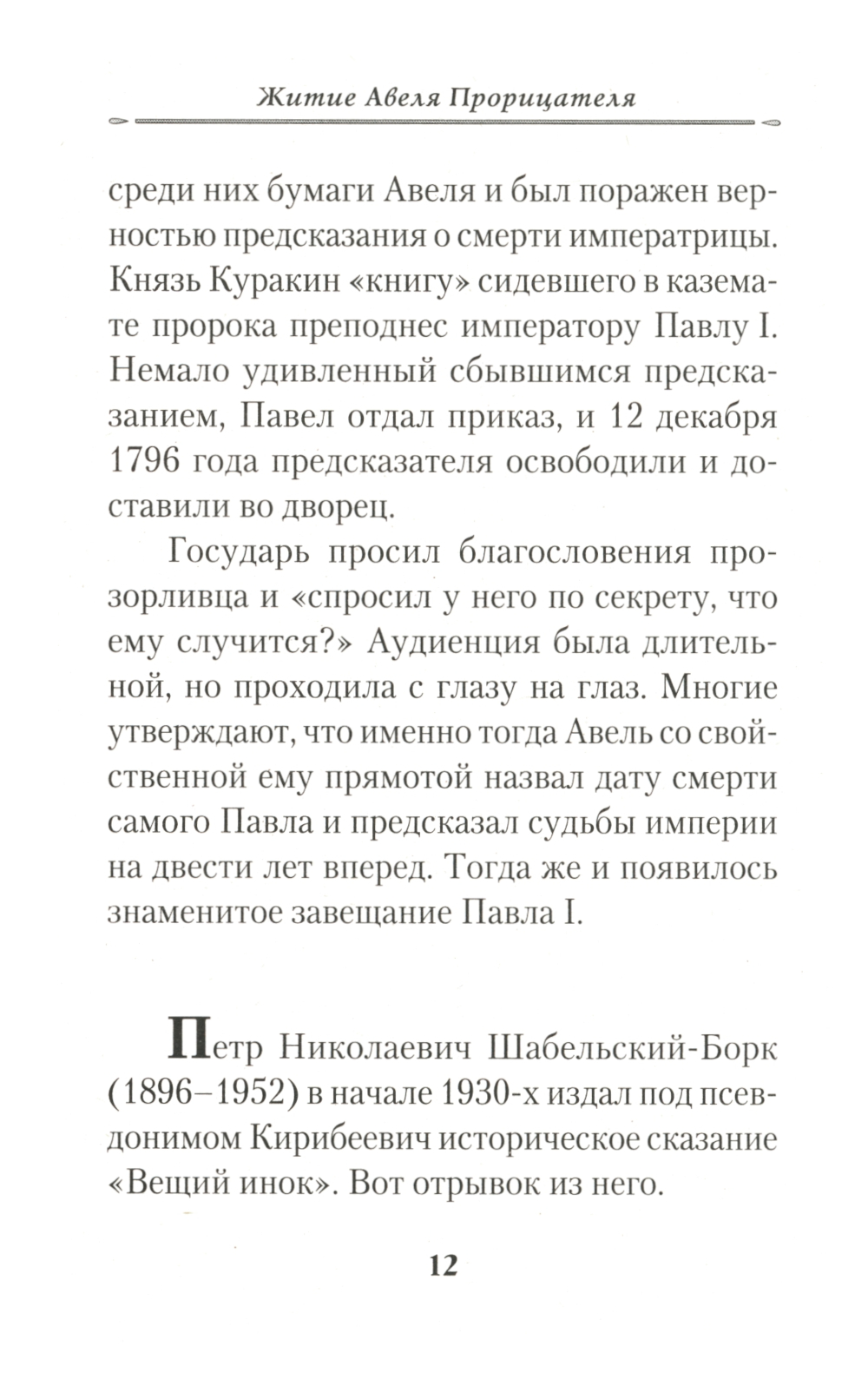Таинственностью, трагизмом и удивительно точными и страшными предсказаниями выделяется монах Авель, получивший прозвище Вещий. Пророчества Авеля касались русской истории на огромный временной отрезок - от правления Великой Екатерины до правления Николая II. А возможно, и далее. По некоторым утверждениям - до самого что ни на есть конца… Монах Авель всегда оставался глубоко верующим человеком, чтившим Церковь. «Его жизнь достойна ужаса и удивления» - так было написано в одной из древних рукописей, озаглавленной: «Жития и страдания отца и монаха Авеля».| Издательство | Сибирская Благозвонница |