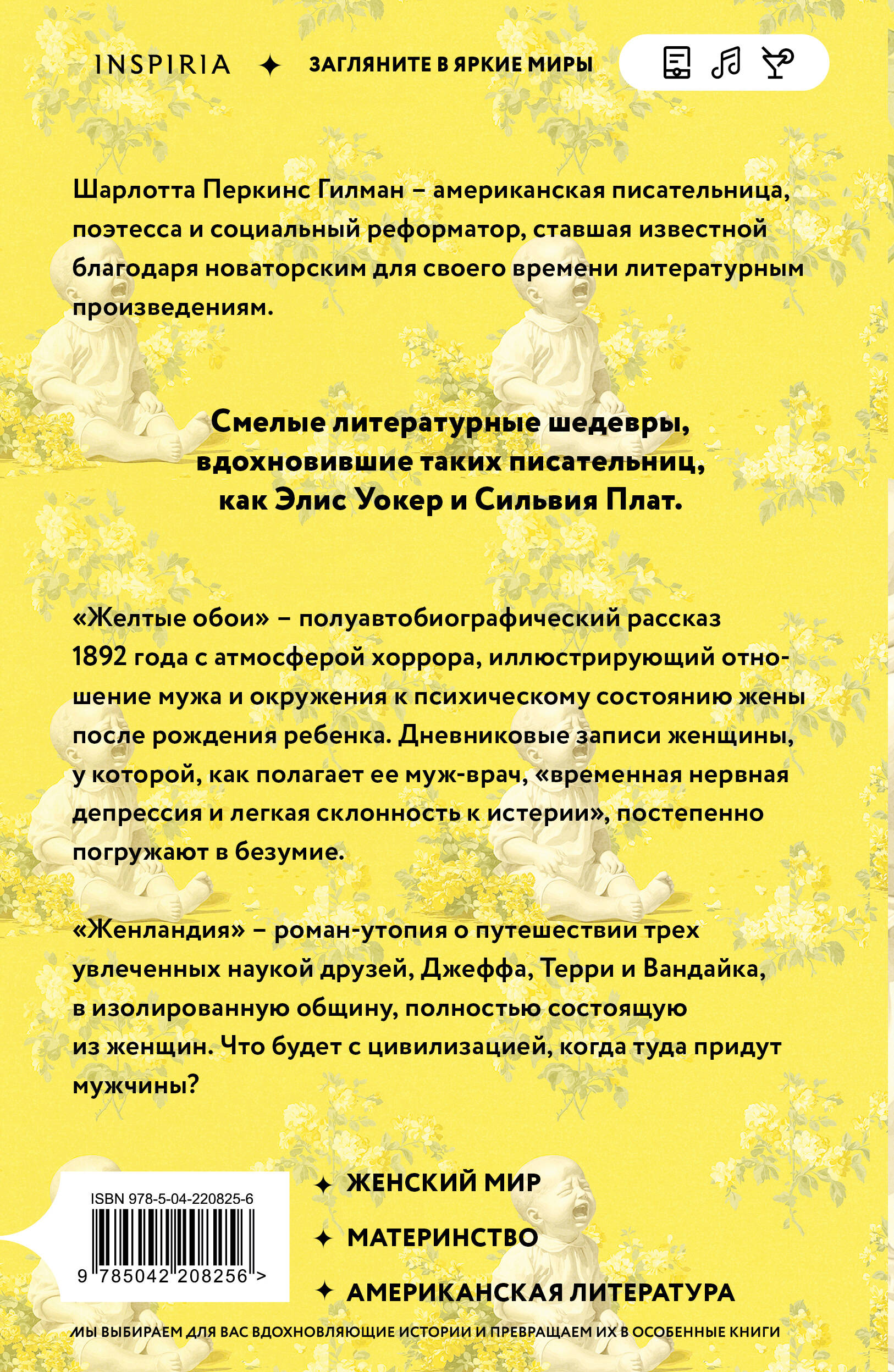 «Желтые обои» - рассказ американской писательницы Шарлотты Перкинс Гилман, впервые опубликованный в январе 1892 года в журнале «Новая Англия». Роман считается важным ранним произведением американской женской литературы об отношении к здоровью женщин в XIX веке. Его также высоко оценивают как произведение в жанре ужасов. История написана в виде сборника дневниковых записей, рассказанных от первого лица. Недавно родившая женщина, чей муж-врач снял на лето старый особняк, пребывает в неспокойном состоянии из-за ужасных желтых обоев, оставшихся в детской комнате на втором этаже. Героиня не выносит вида этих обоев, ей мерещатся разные тревожные образы, и мы постепенно погружаемся в ее состояние. «Женландия» - утопический роман об изолированном обществе, состоящем исключительно из женщин, - обществе, свободном от войн и конфликтов. Но ровно до тех пор, пока туда не прибудут мужчины.| Издательство | ООО "Издательство "Эксмо" |