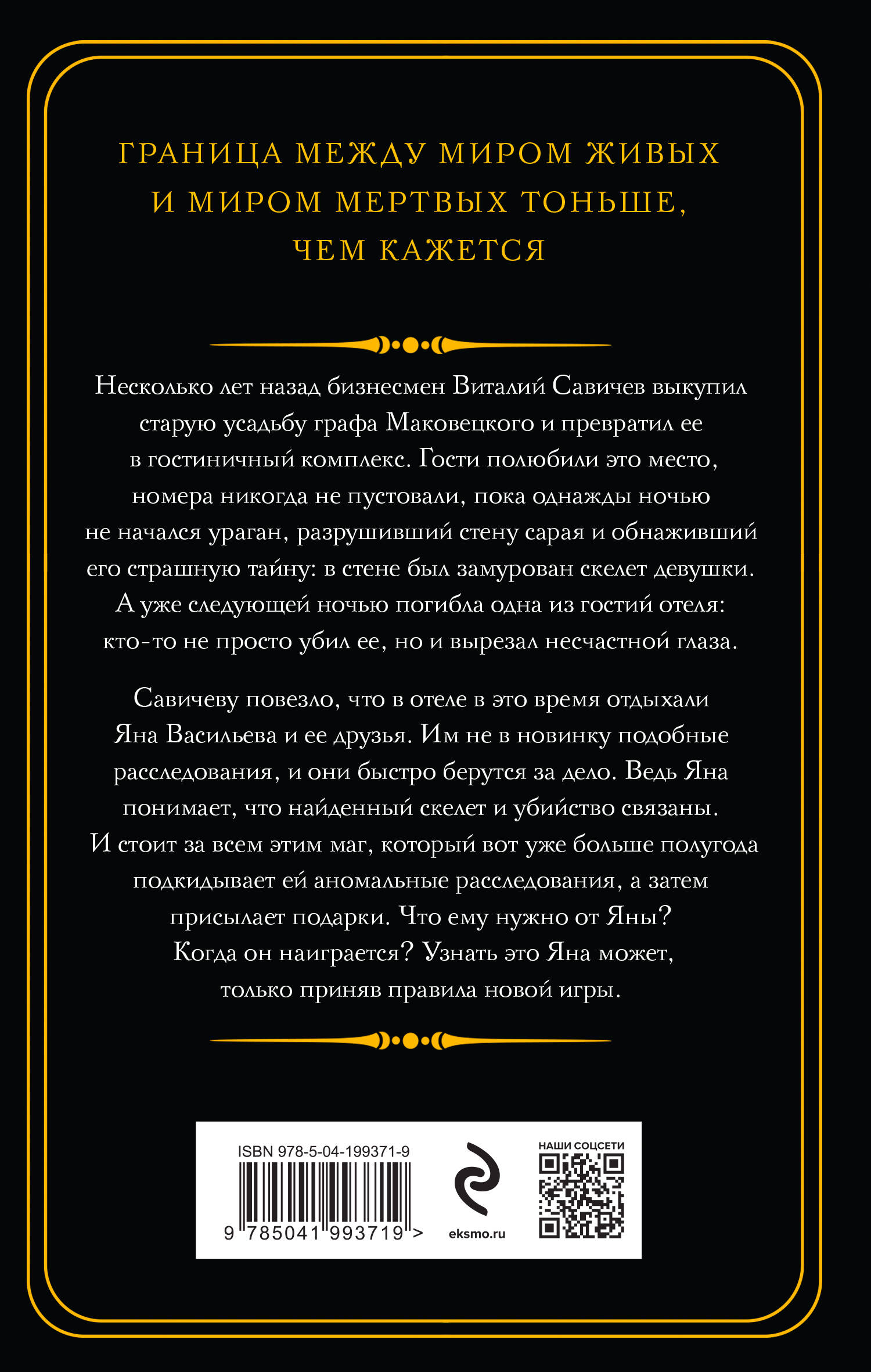 Захватывающее детективное фэнтези, увлекающее с первой страницы. Романы Натальи Тимошенко пропитаны мистикой и тайной. В них оживают лесные чудовища, посланники из мира мертвых и старые добрые домовые. А знаете ли вы, какие тайны хранят старинные поместья? Уже полюбившимся героям вновь предстоит сложное расследование, от которого просто невозможно оторваться. Несколько лет назад бизнесмен Виталий Савичев выкупил старую усадьбу графа Маковецкого и превратил ее в гостиничный комплекс. Гости полюбили это место, номера никогда не пустовали, пока однажды ночью не начался ураган, разрушивший стену сарая и обнаживший его страшную тайну: в стене был замурован скелет девушки. А уже следующей ночью погибла одна из гостий отеля: кто-то не просто убил ее, но и вырезал несчастной глаза. Савичеву повезло, что в отеле в это время отдыхали Яна Васильева и ее друзья. Им не в новинку подобные расследования, и они быстро берутся за дело. Ведь Яна понимает, что найденный скелет и убийство связаны. И стоит за всем этим маг, который вот уже больше полугода подкидывает ей аномальные расследования, а затем присылает подарки. Что ему нужно от Яны? Когда он наиграется? Узнать это Яна может, только приняв правила новой игры.