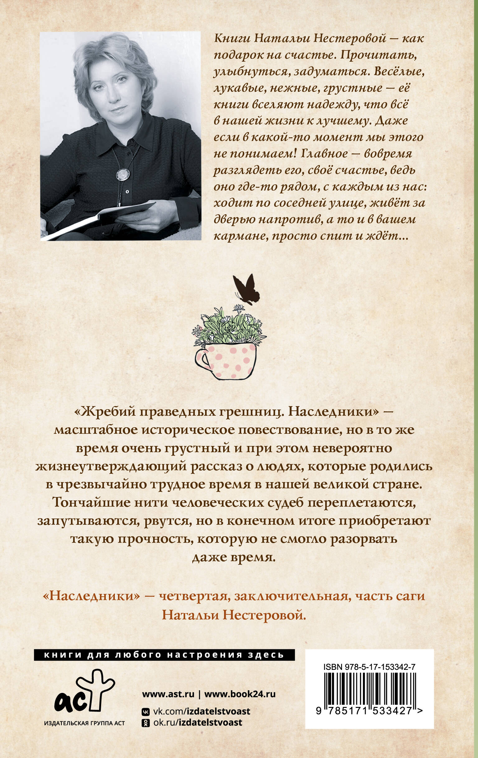 "Жребий праведных грешниц. Наследники" - масштабное историческое повествование, но в то же время очень грустный и при этом невероятно жизнеутверждающий рассказ о людях, которые родились в чрезвычайно трудное время в нашей великой стране. Тончайшие нити человеческих судеб переплетаются, запутываются, рвутся, но в конечном итоге приобретают такую прочность, которую не смогло разорвать даже время. "Наследники" - четвертая, заключительная, часть саги Натальи Нестеровой.| Издательство | ИЗДАТЕЛЬСТВО "АСТ" |